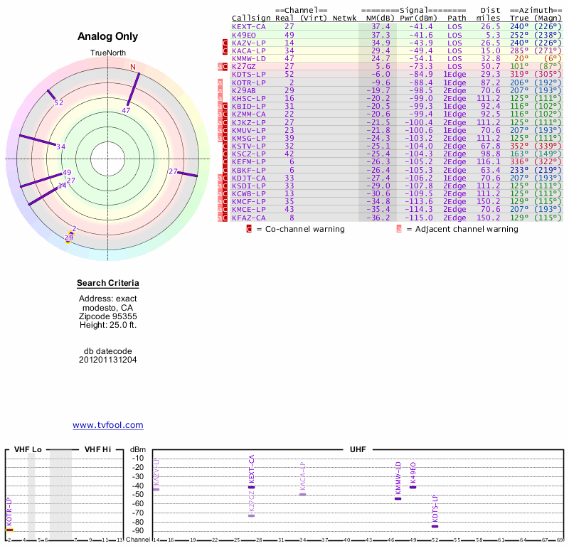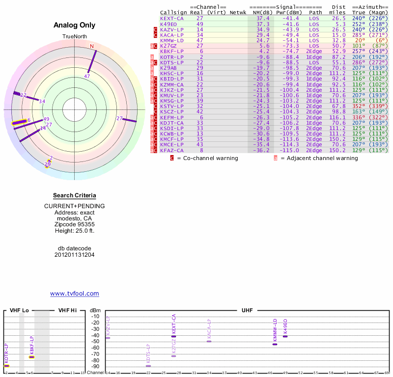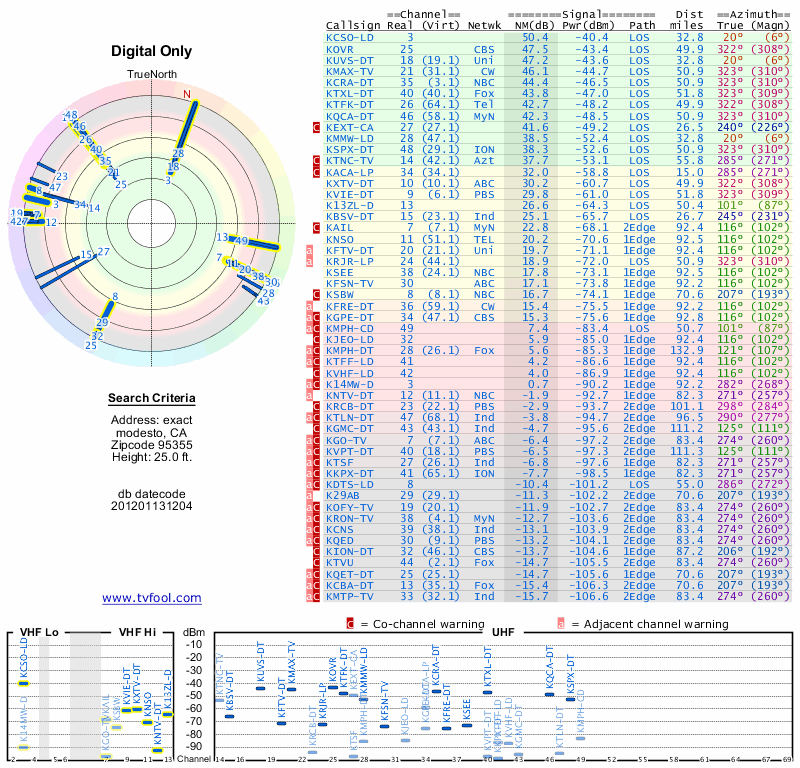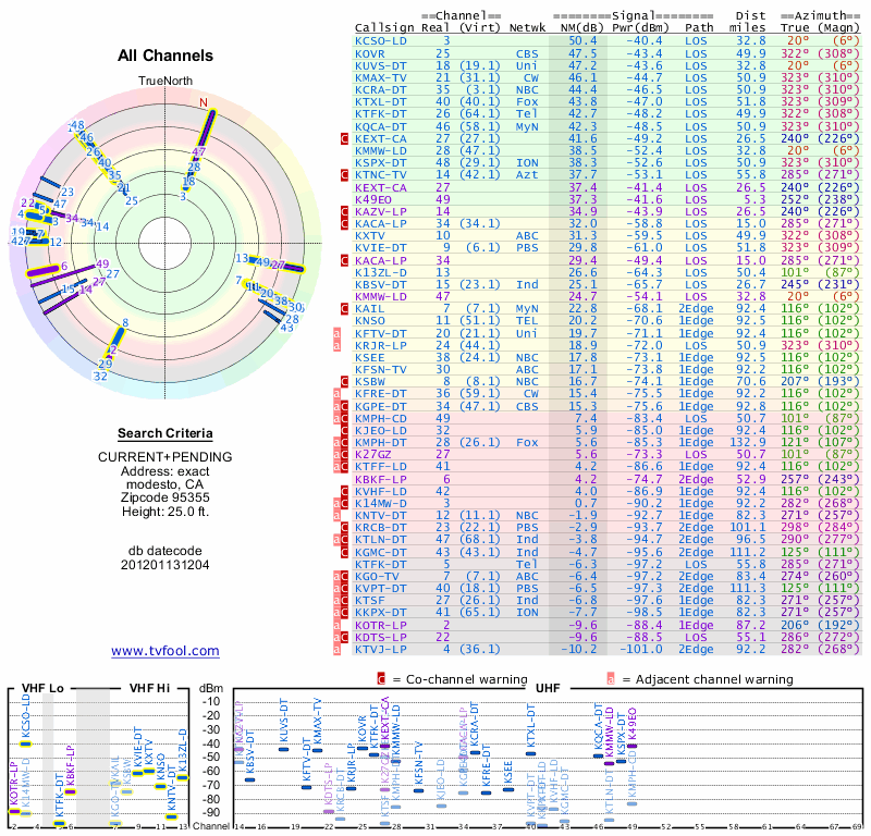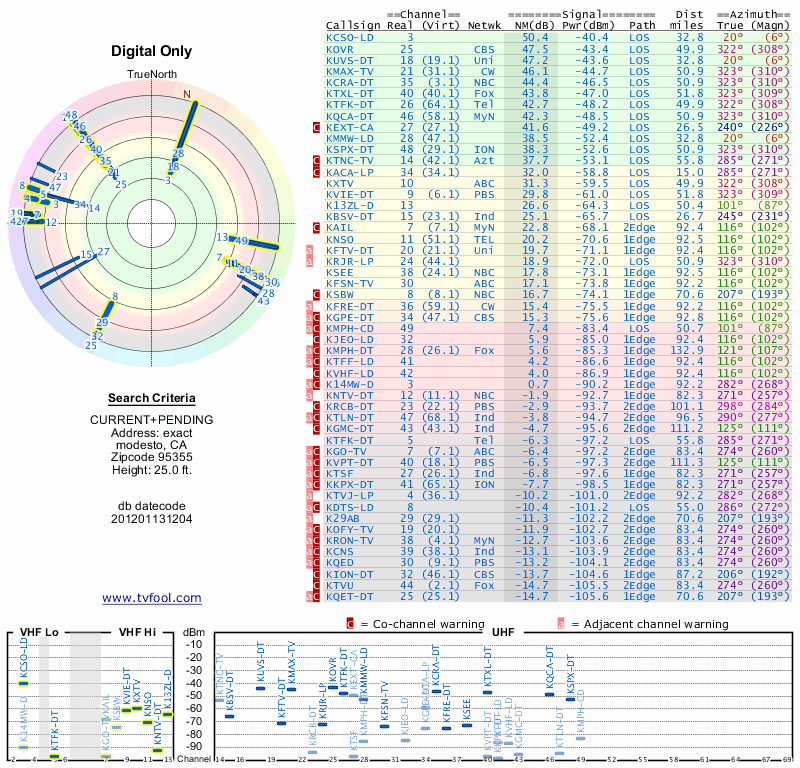 Here are the results for your location. The transmitter database was last updated on June 7, 2013. For more information about these plots and how to interpret them, please check out the Signal Analysis FAQ.