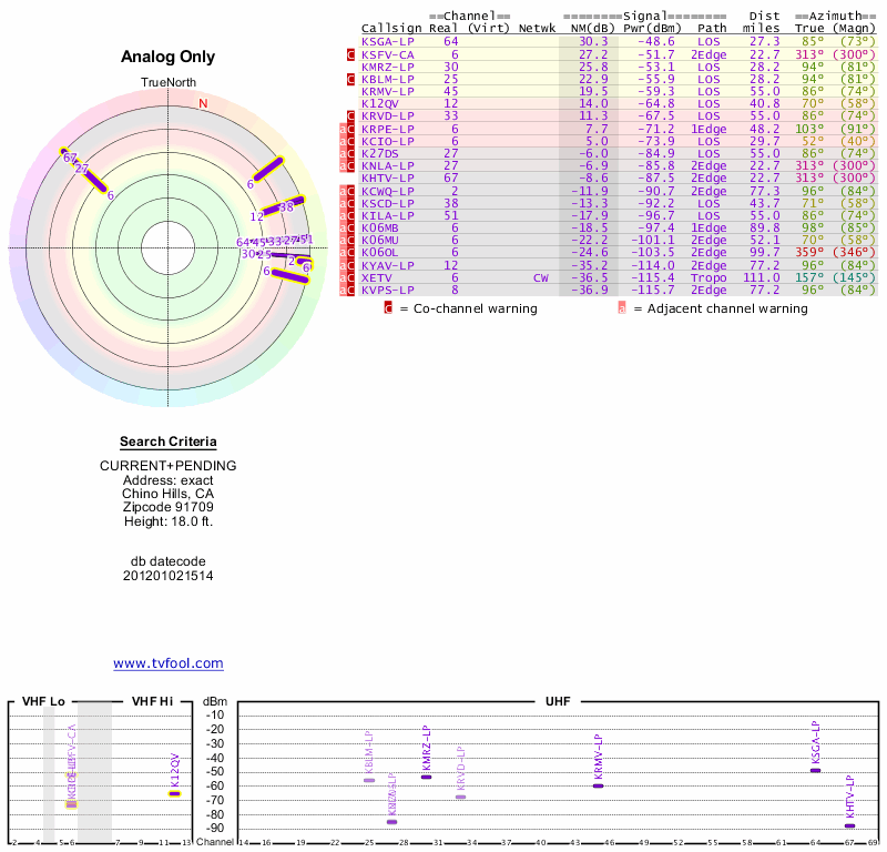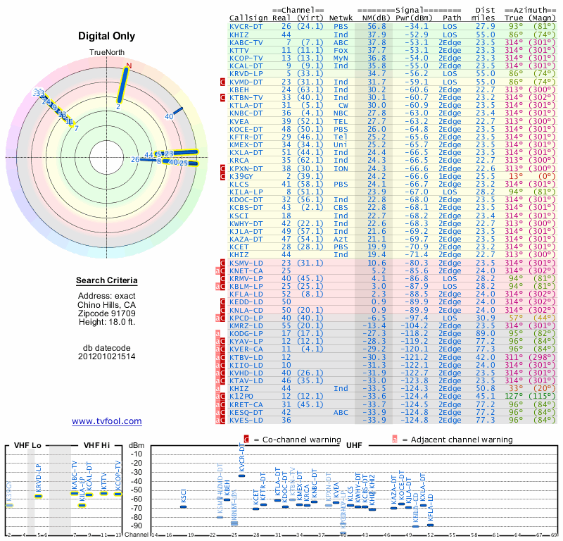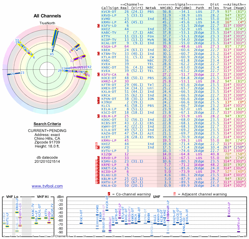 Here are the results for your location. The transmitter database was last updated on June 7, 2013. For more information about these plots and how to interpret them, please check out the Signal Analysis FAQ.