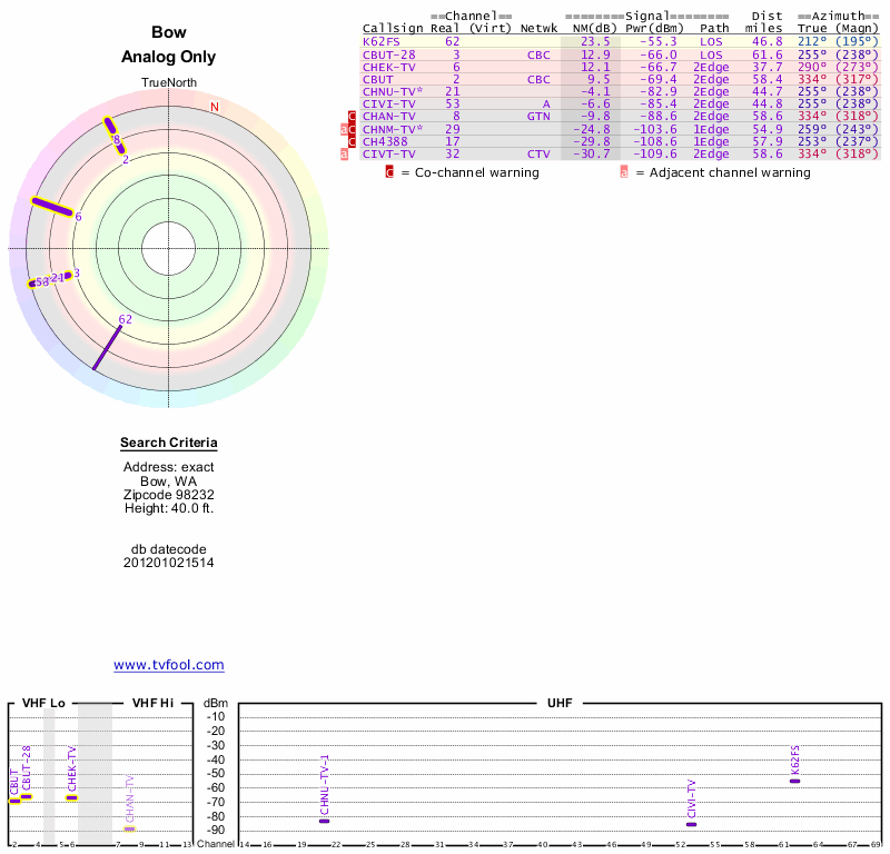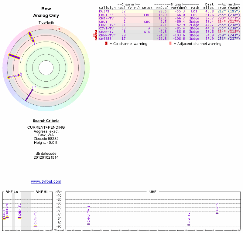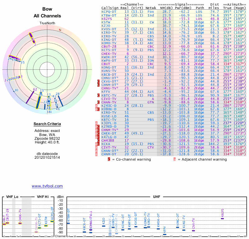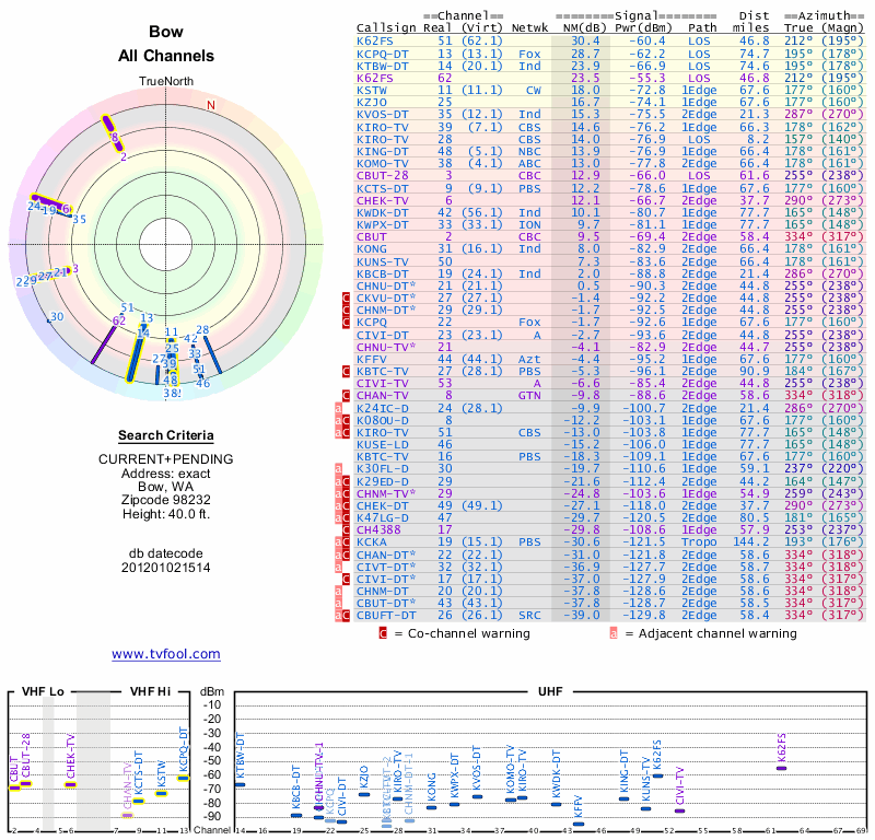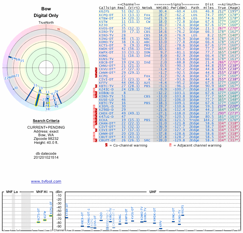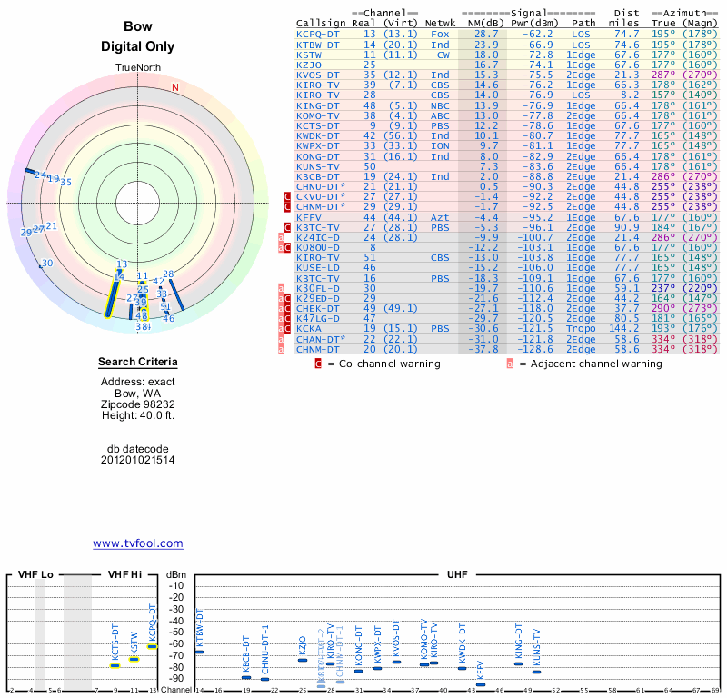 Here are the results for your location. The transmitter database was last updated on June 7, 2013. For more information about these plots and how to interpret them, please check out the Signal Analysis FAQ.