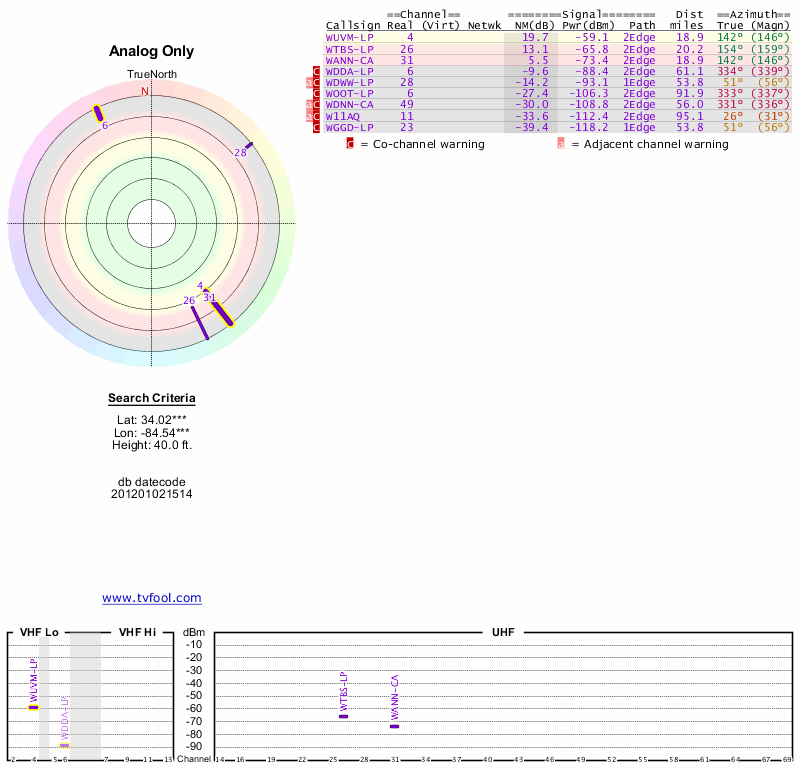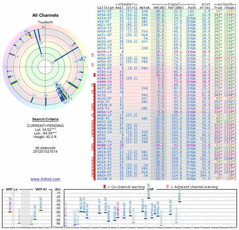 Here are the results for your location. The transmitter database was last updated on June 7, 2013. For more information about these plots and how to interpret them, please check out the Signal Analysis FAQ.