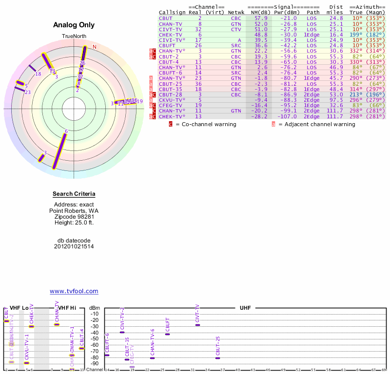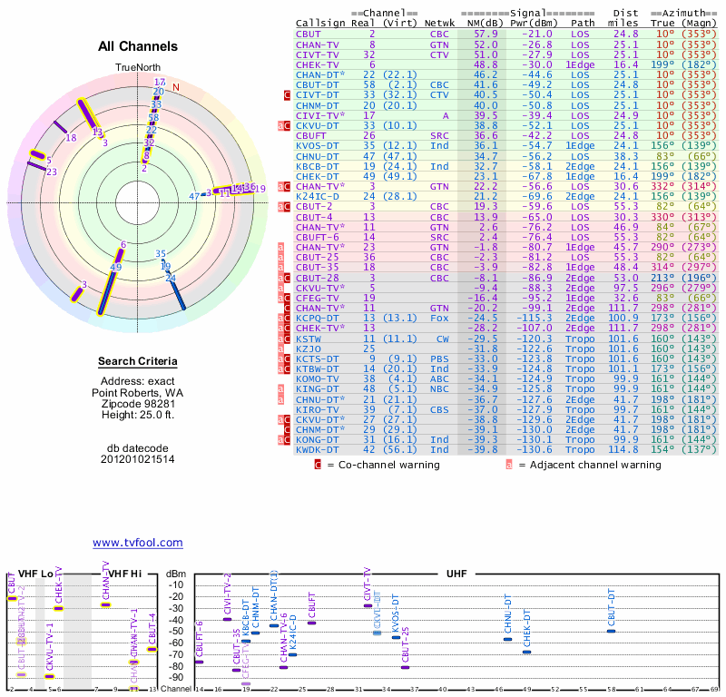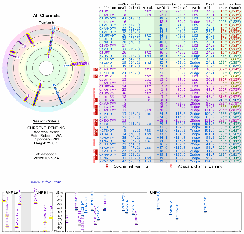 Here are the results for your location. The transmitter database was last updated on June 7, 2013. For more information about these plots and how to interpret them, please check out the Signal Analysis FAQ.