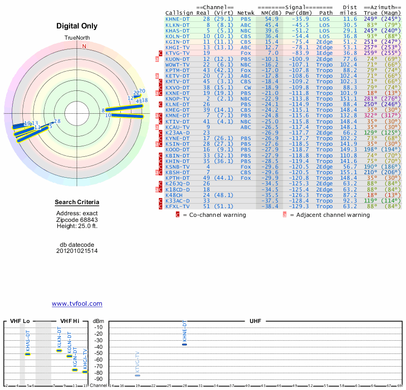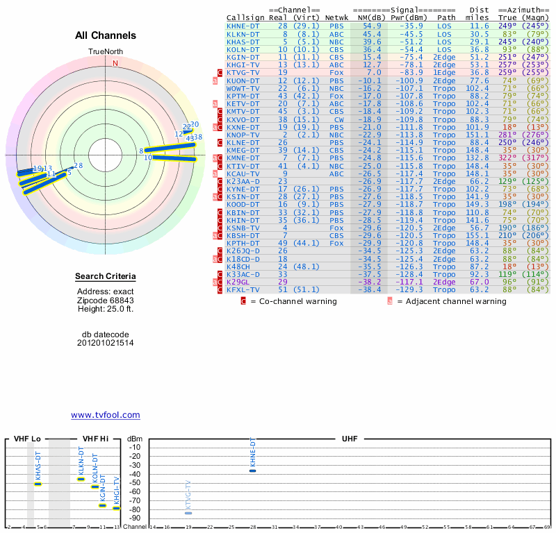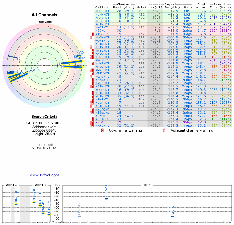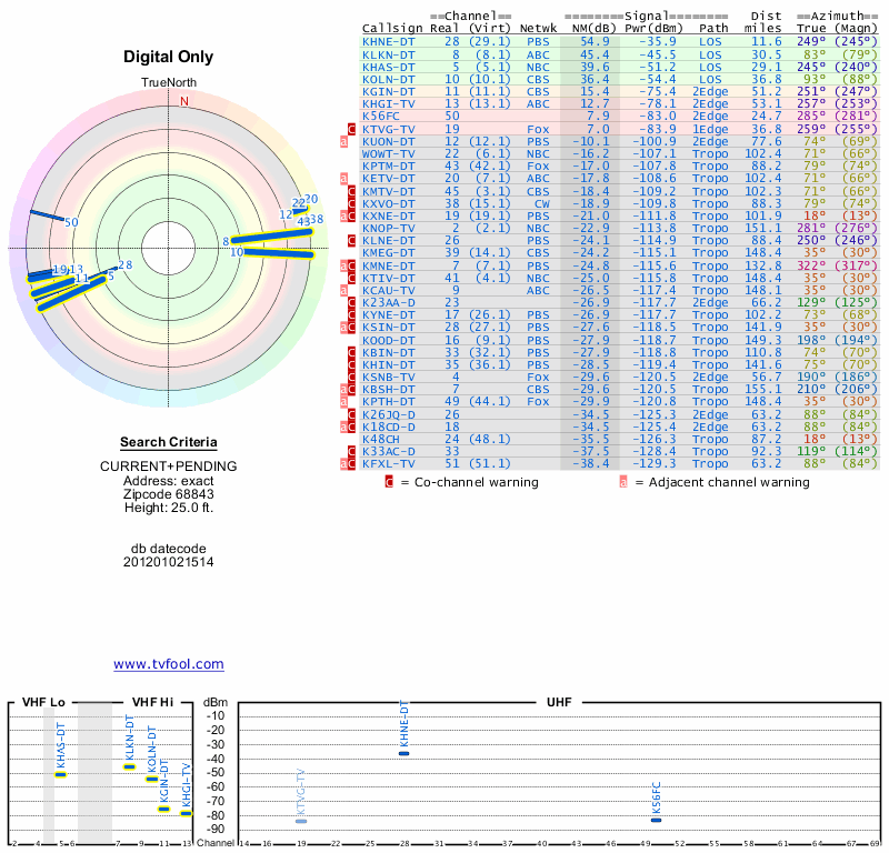 Here are the results for your location. The transmitter database was last updated on June 7, 2013. For more information about these plots and how to interpret them, please check out the Signal Analysis FAQ.