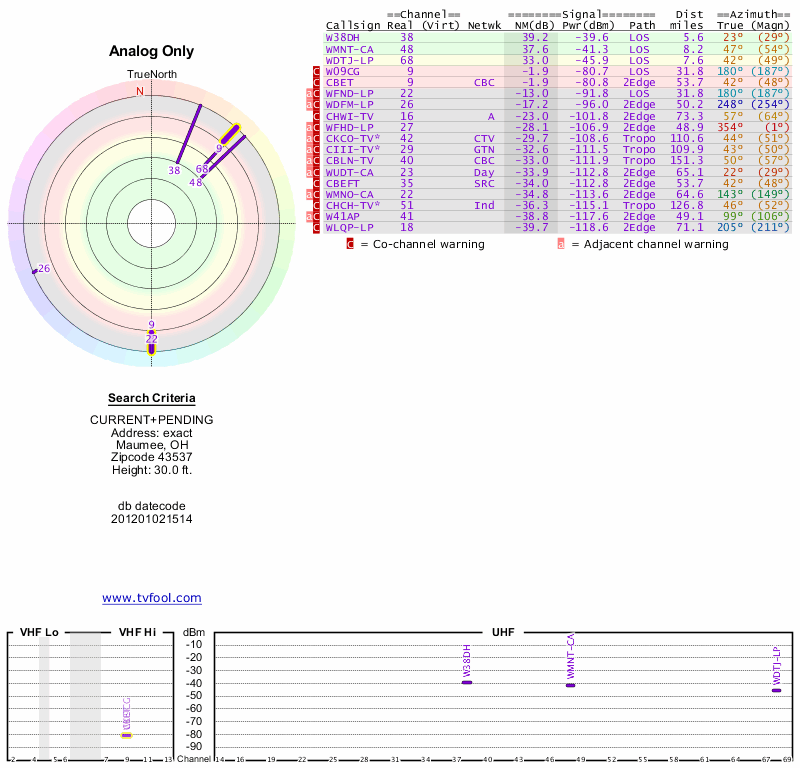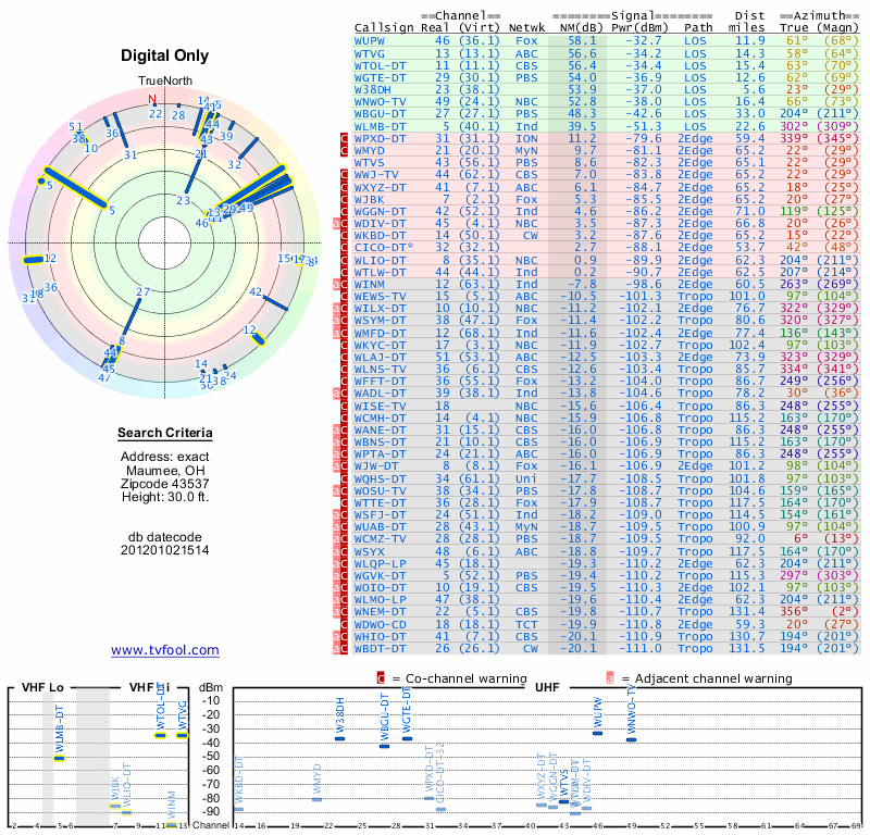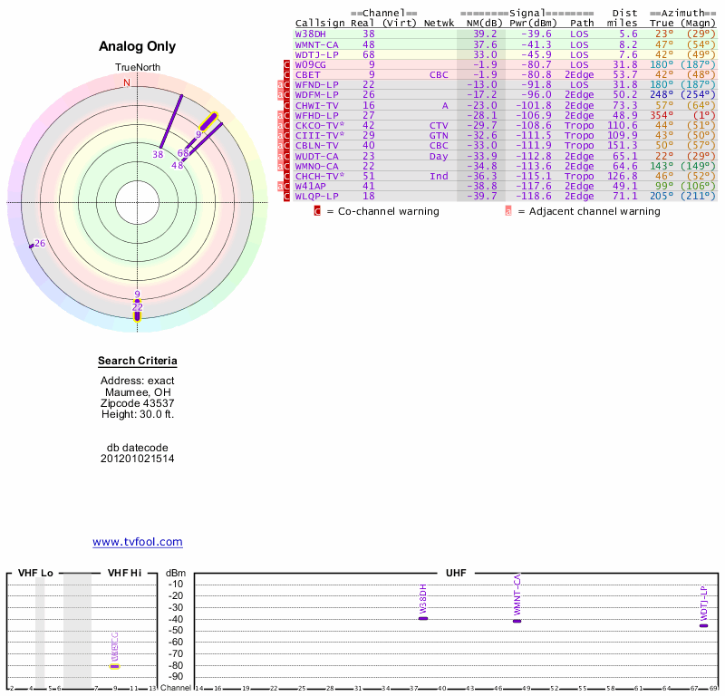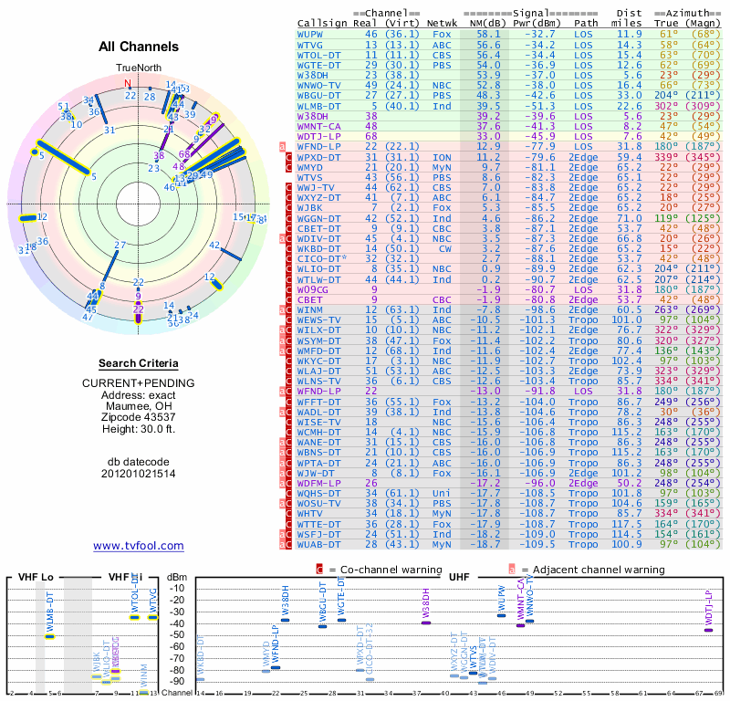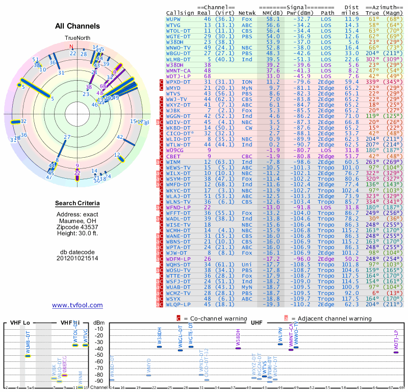 Here are the results for your location. The transmitter database was last updated on June 7, 2013. For more information about these plots and how to interpret them, please check out the Signal Analysis FAQ.