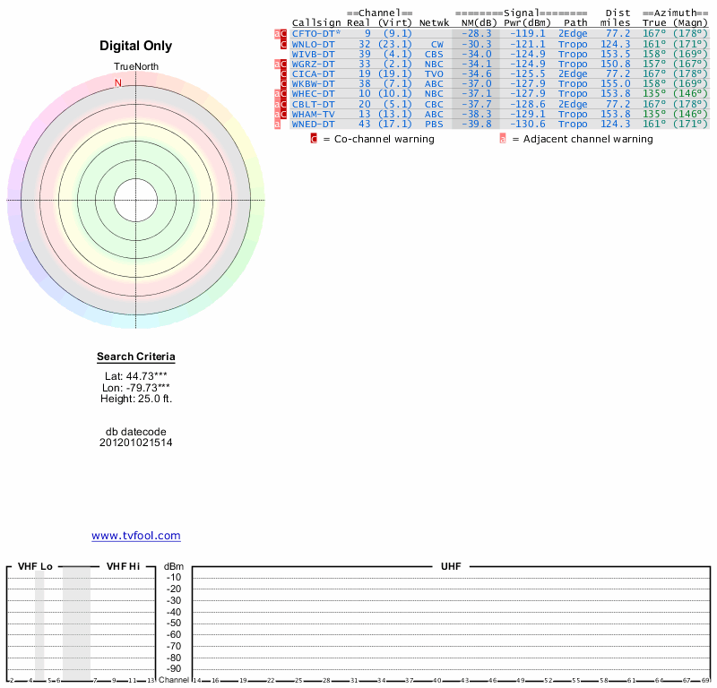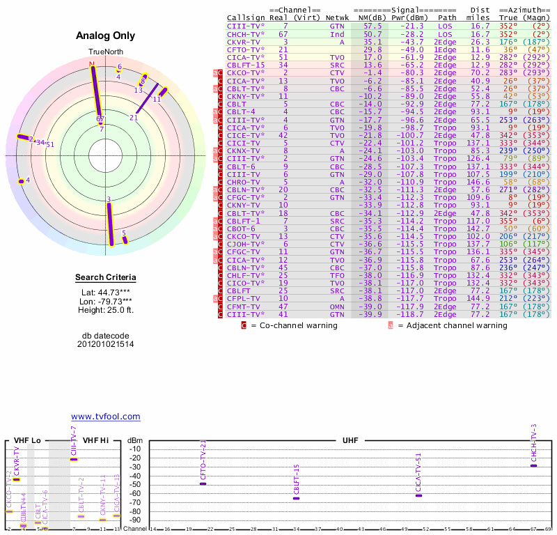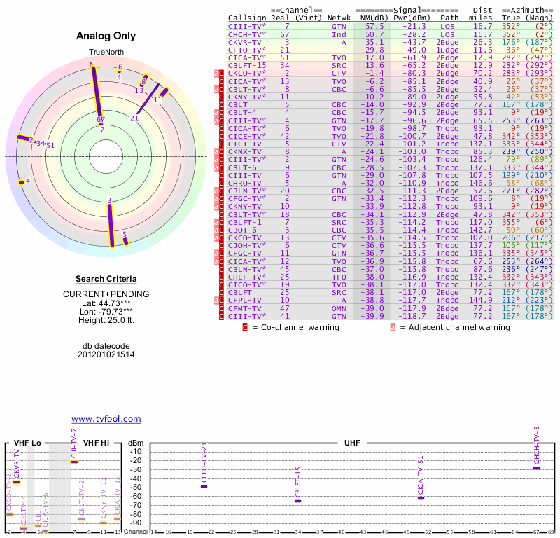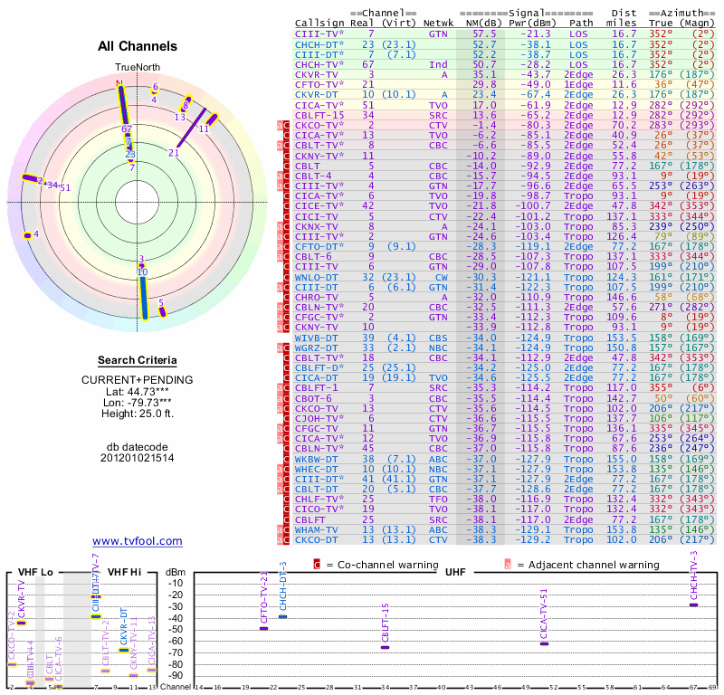 Here are the results for your location. The transmitter database was last updated on June 7, 2013. For more information about these plots and how to interpret them, please check out the Signal Analysis FAQ.