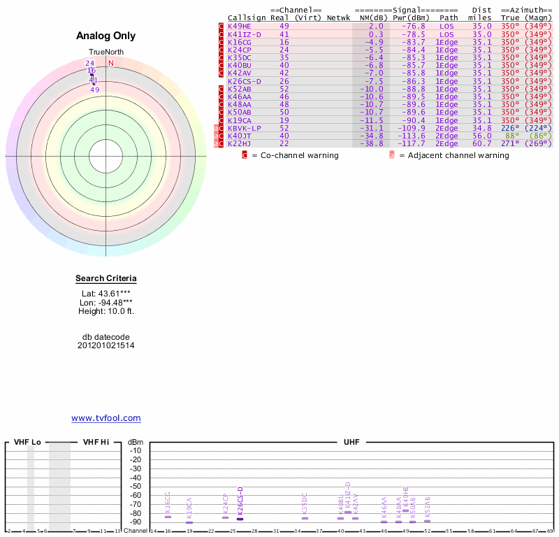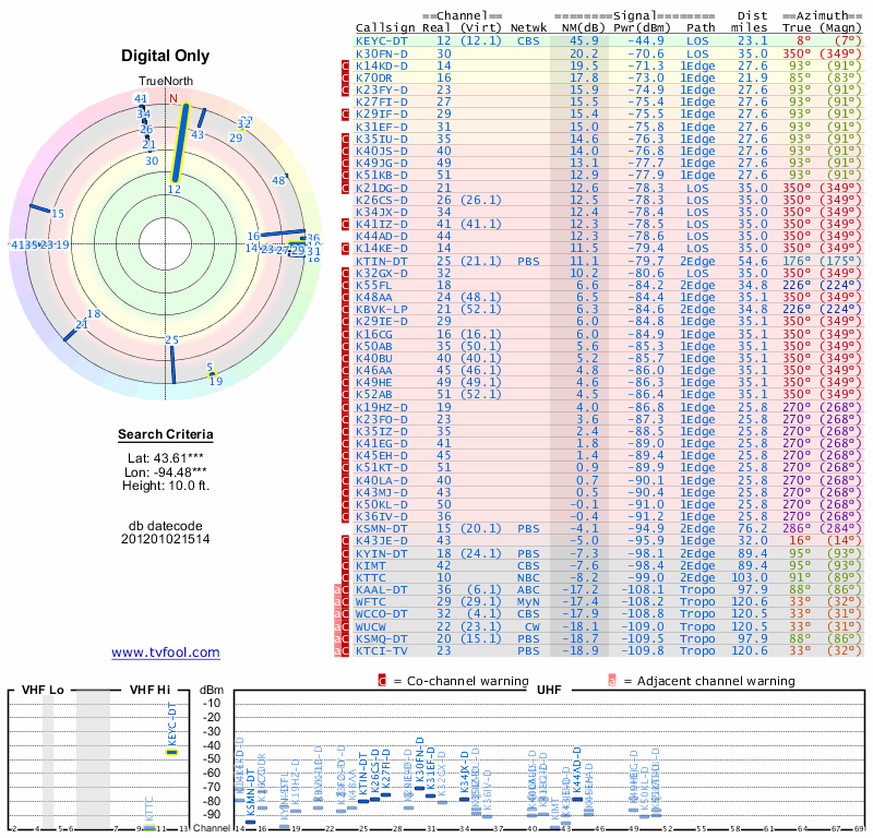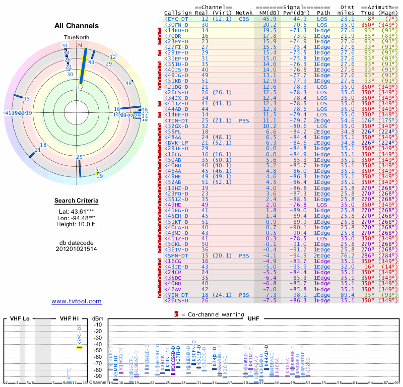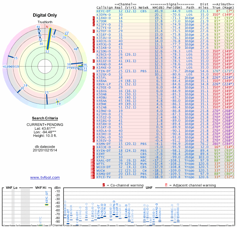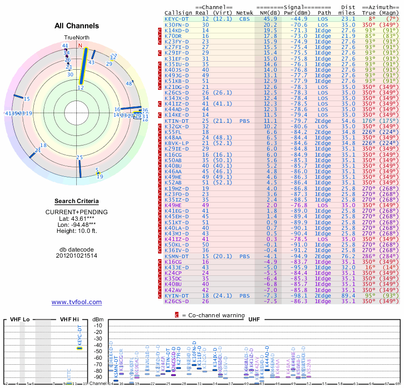 Here are the results for your location. The transmitter database was last updated on June 7, 2013. For more information about these plots and how to interpret them, please check out the Signal Analysis FAQ.