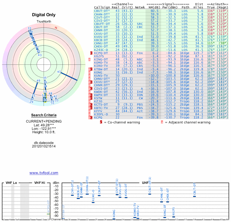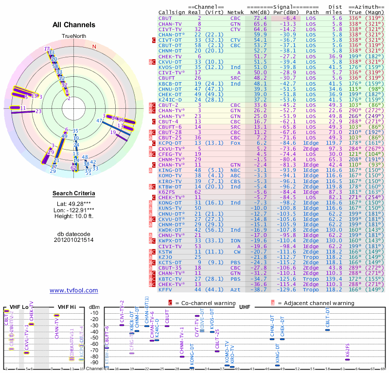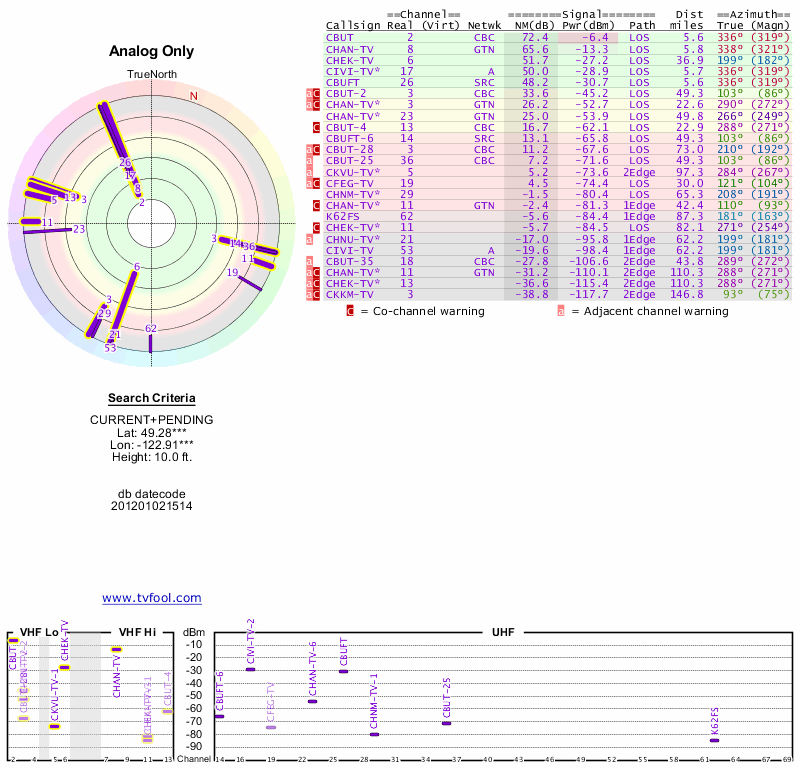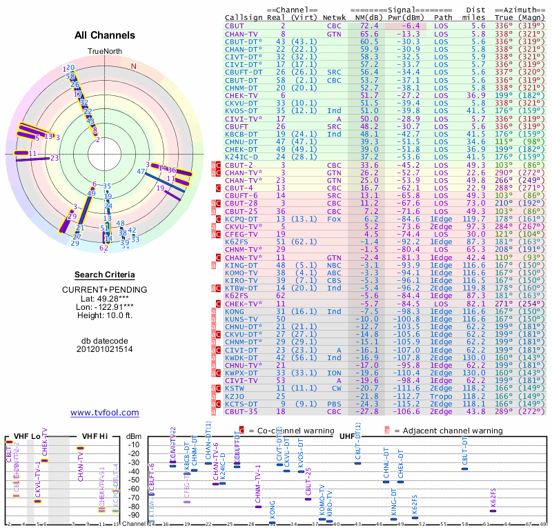 Here are the results for your location. The transmitter database was last updated on June 7, 2013. For more information about these plots and how to interpret them, please check out the Signal Analysis FAQ.