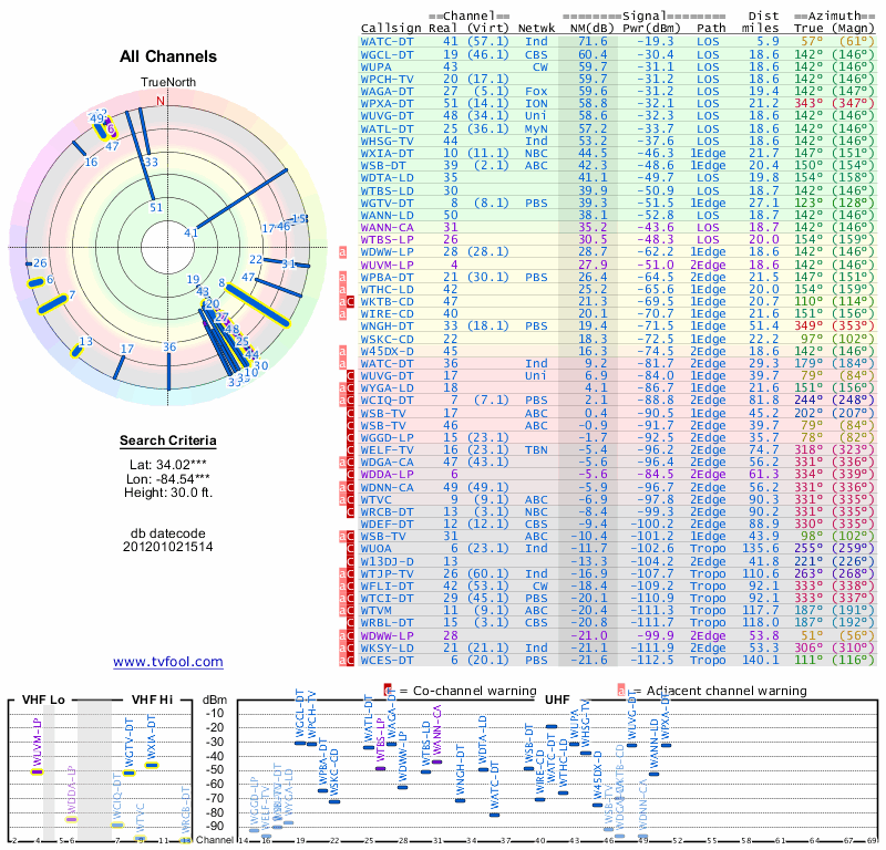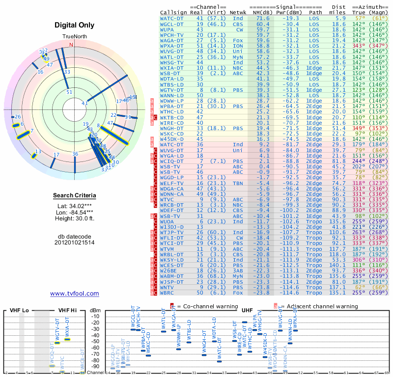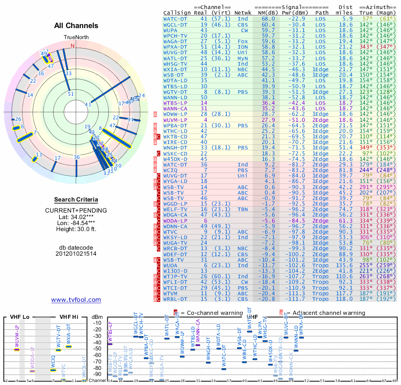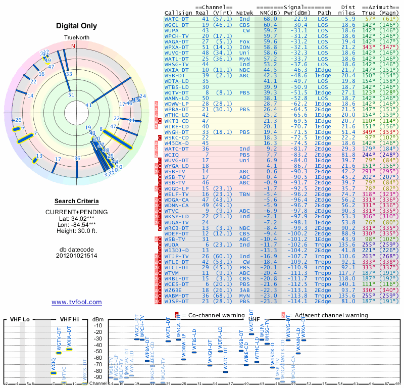 Here are the results for your location. The transmitter database was last updated on June 7, 2013. For more information about these plots and how to interpret them, please check out the Signal Analysis FAQ.