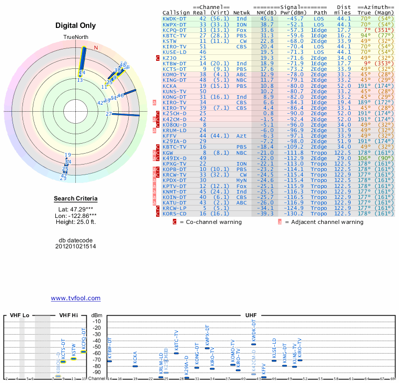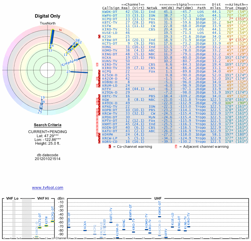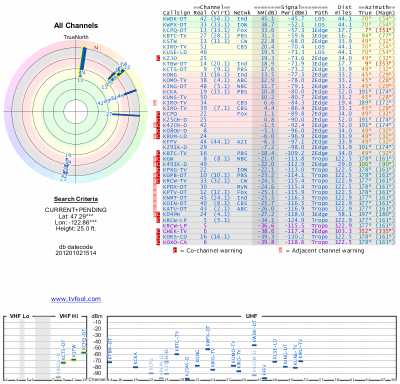 Here are the results for your location. The transmitter database was last updated on June 7, 2013. For more information about these plots and how to interpret them, please check out the Signal Analysis FAQ.