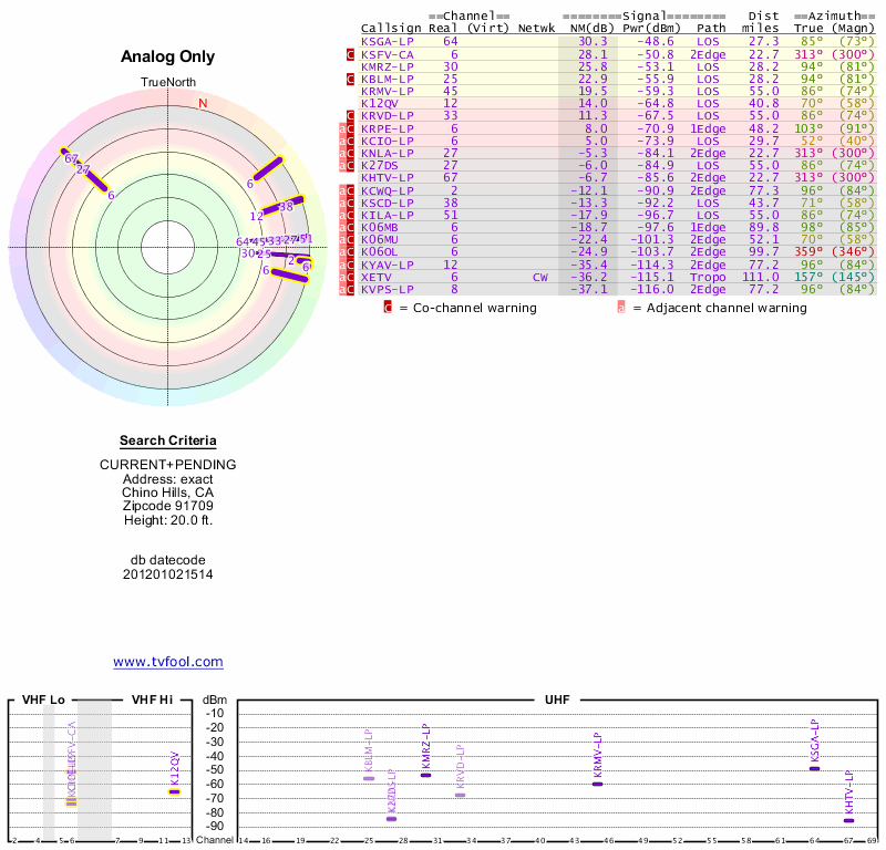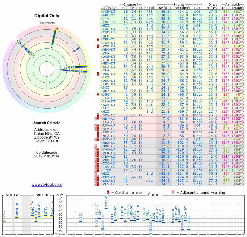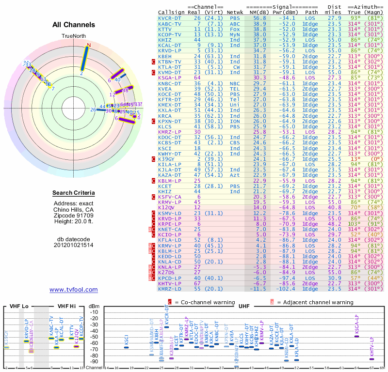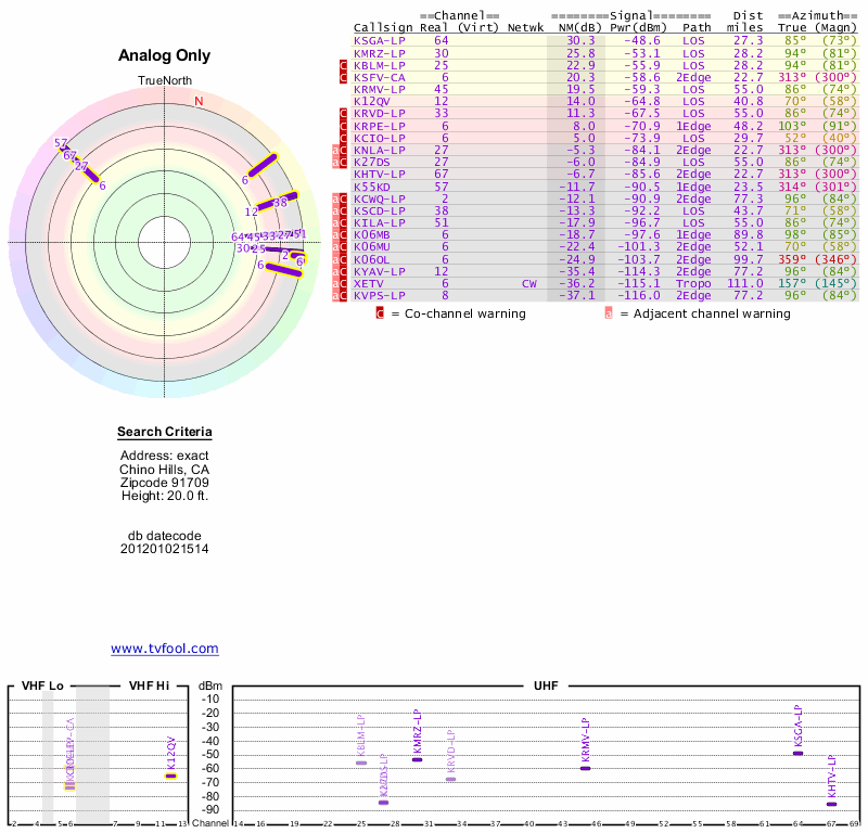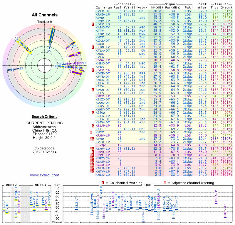 Here are the results for your location. The transmitter database was last updated on June 7, 2013. For more information about these plots and how to interpret them, please check out the Signal Analysis FAQ.