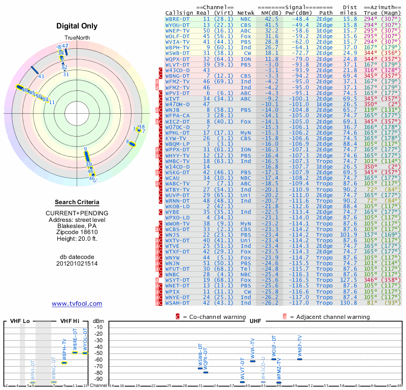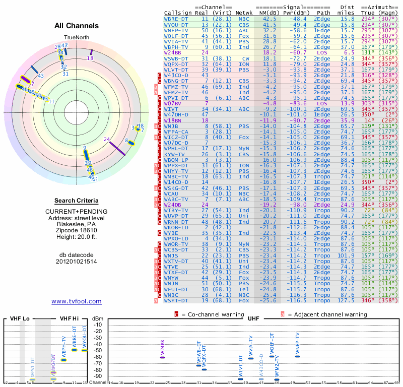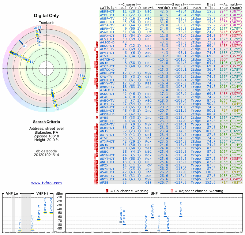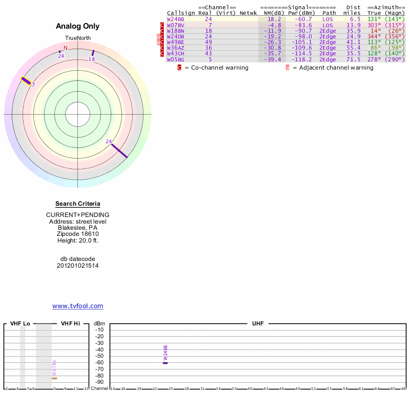 Here are the results for your location. The transmitter database was last updated on June 7, 2013. For more information about these plots and how to interpret them, please check out the Signal Analysis FAQ.