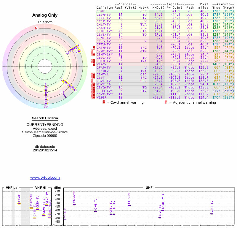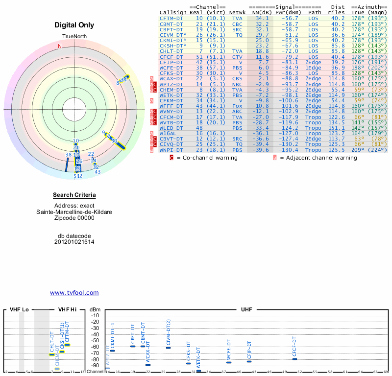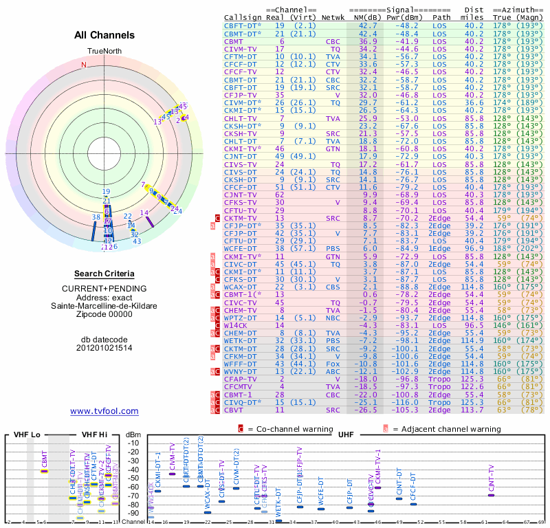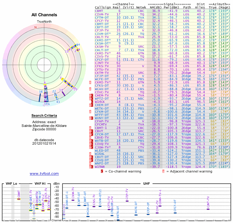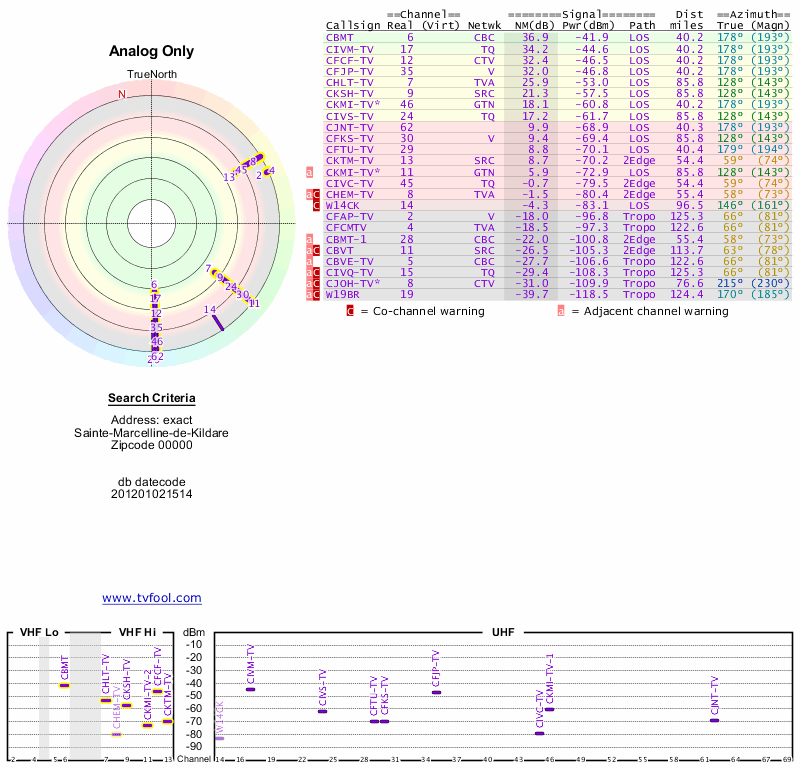Here are the results for your location. The transmitter database was last updated on June 7, 2013. For more information about these plots and how to interpret them, please check out the Signal Analysis FAQ.