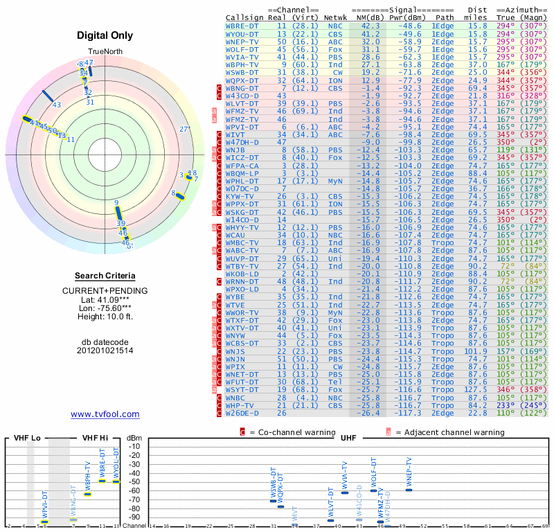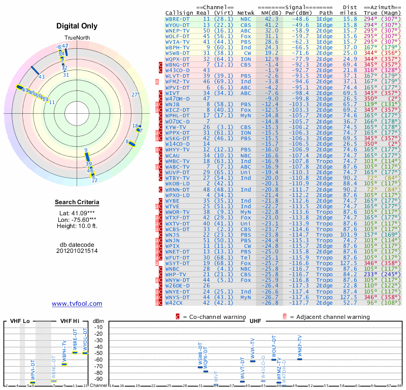 Here are the results for your location. The transmitter database was last updated on June 7, 2013. For more information about these plots and how to interpret them, please check out the Signal Analysis FAQ.