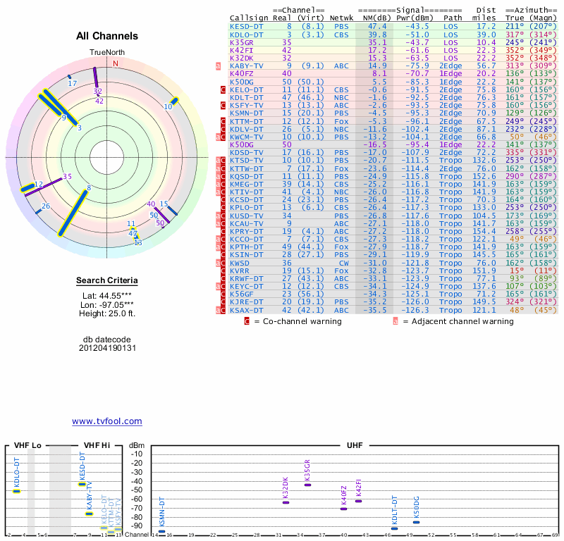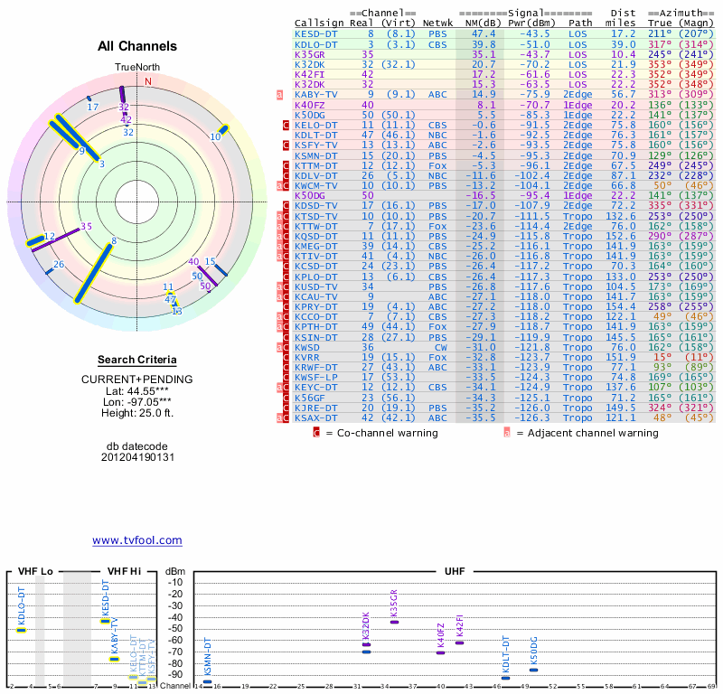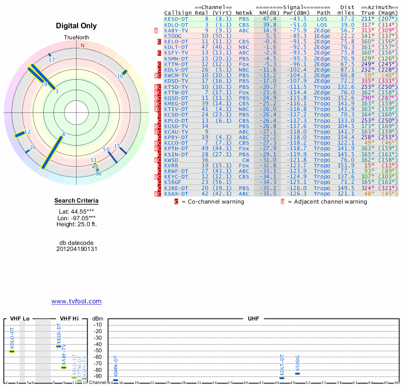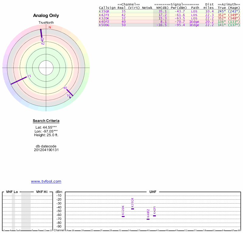 Here are the results for your location. The transmitter database was last updated on June 7, 2013. For more information about these plots and how to interpret them, please check out the Signal Analysis FAQ.