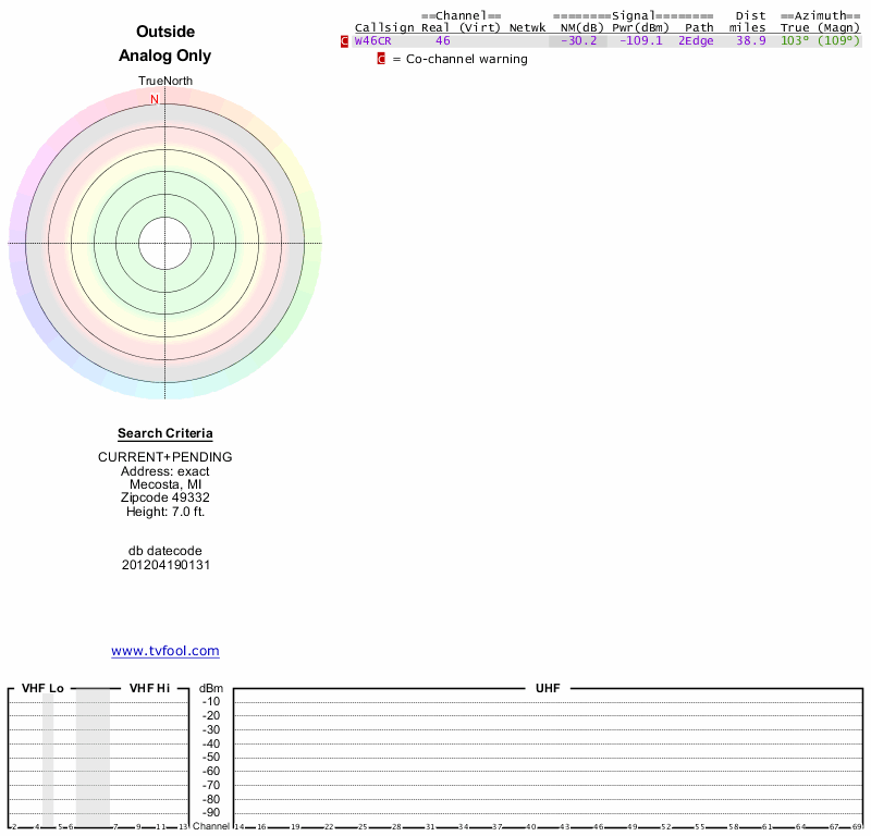Here are the results for your location. The transmitter database was last updated on June 7, 2013. For more information about these plots and how to interpret them, please check out the Signal Analysis FAQ.