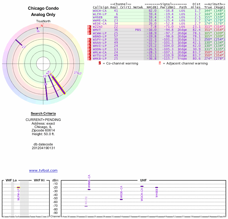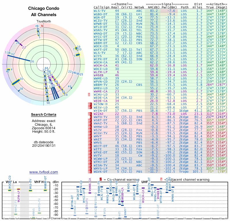 Here are the results for your location. The transmitter database was last updated on June 7, 2013. For more information about these plots and how to interpret them, please check out the Signal Analysis FAQ.