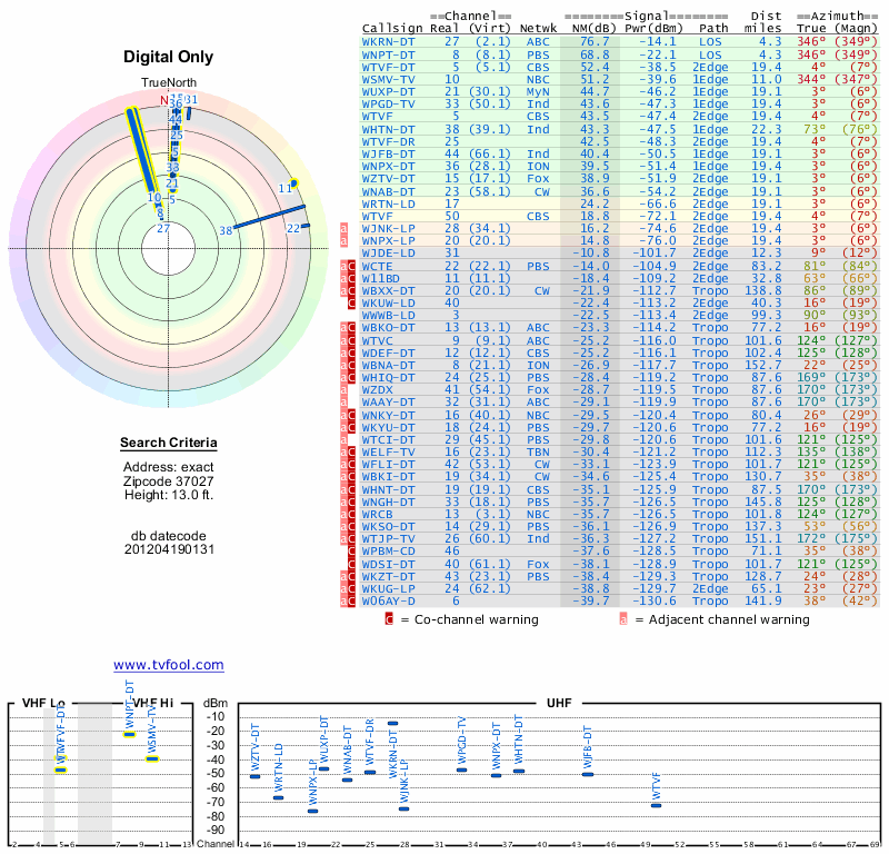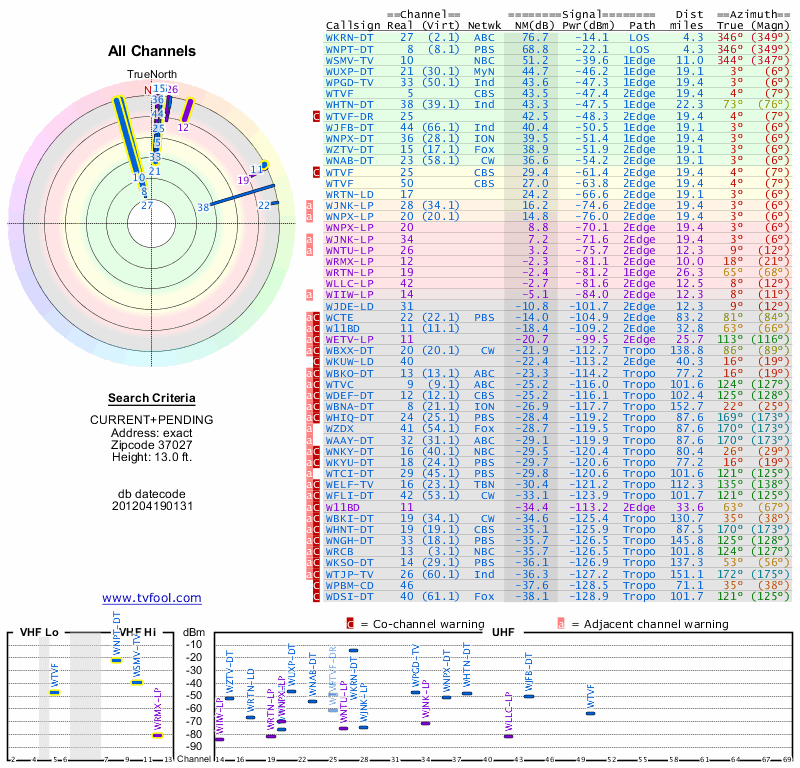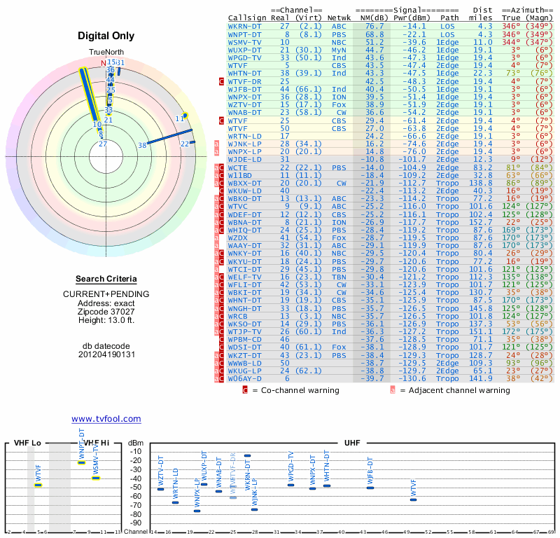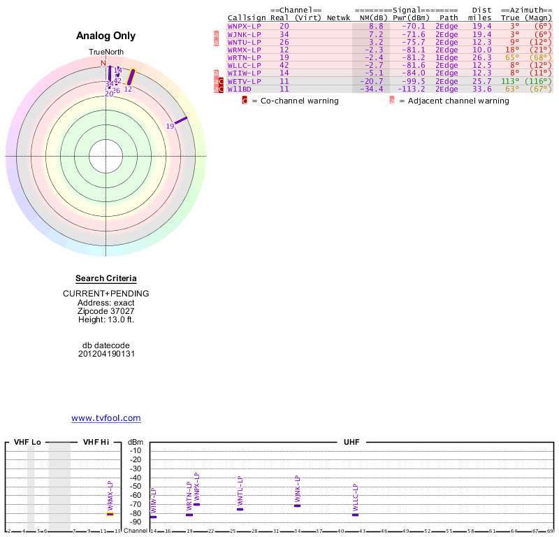 Here are the results for your location. The transmitter database was last updated on June 7, 2013. For more information about these plots and how to interpret them, please check out the Signal Analysis FAQ.
