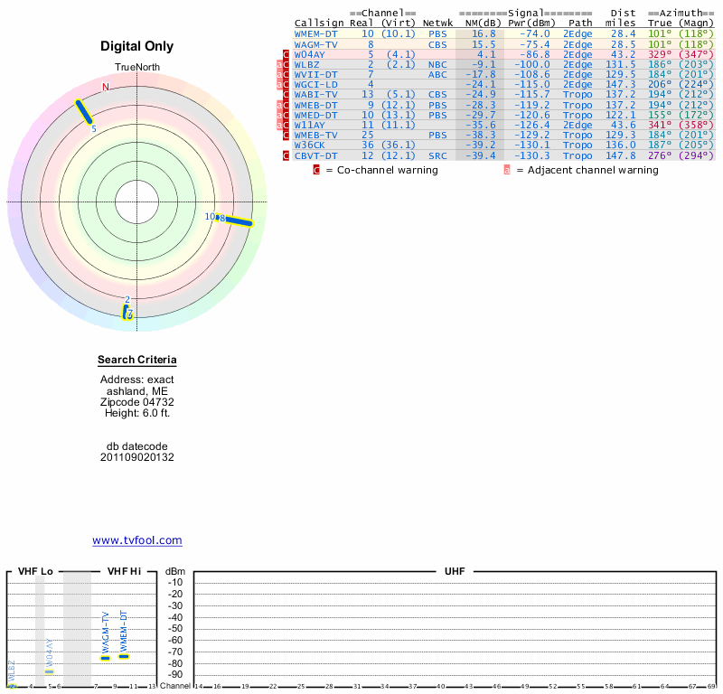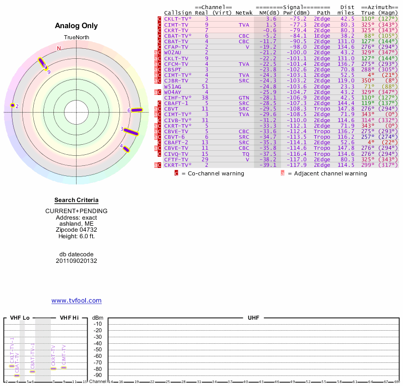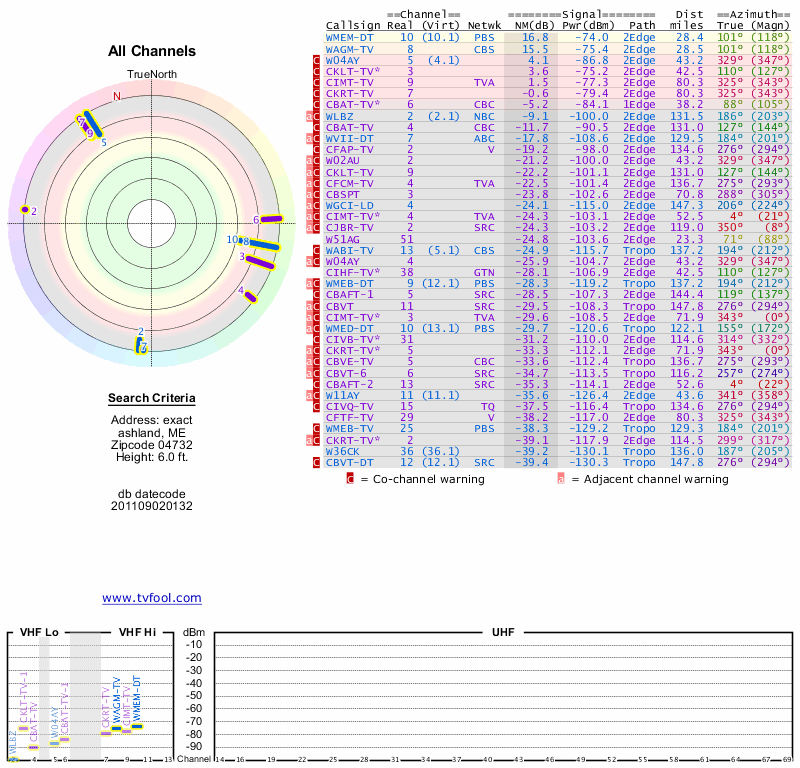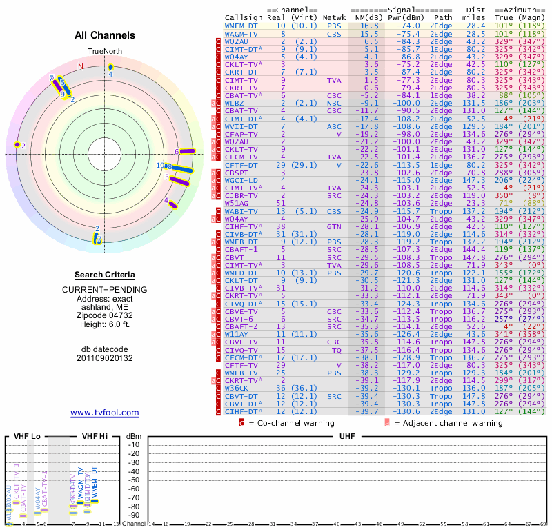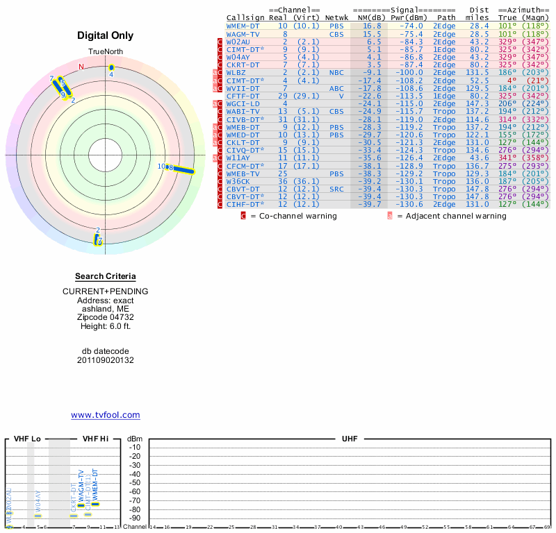 Here are the results for your location. The transmitter database was last updated on June 7, 2013. For more information about these plots and how to interpret them, please check out the Signal Analysis FAQ.