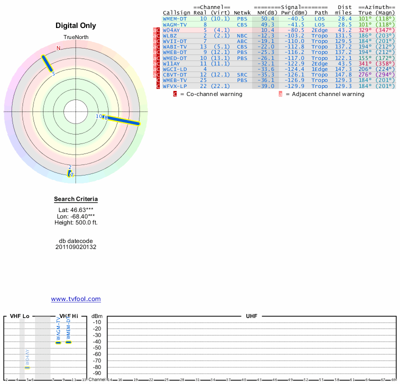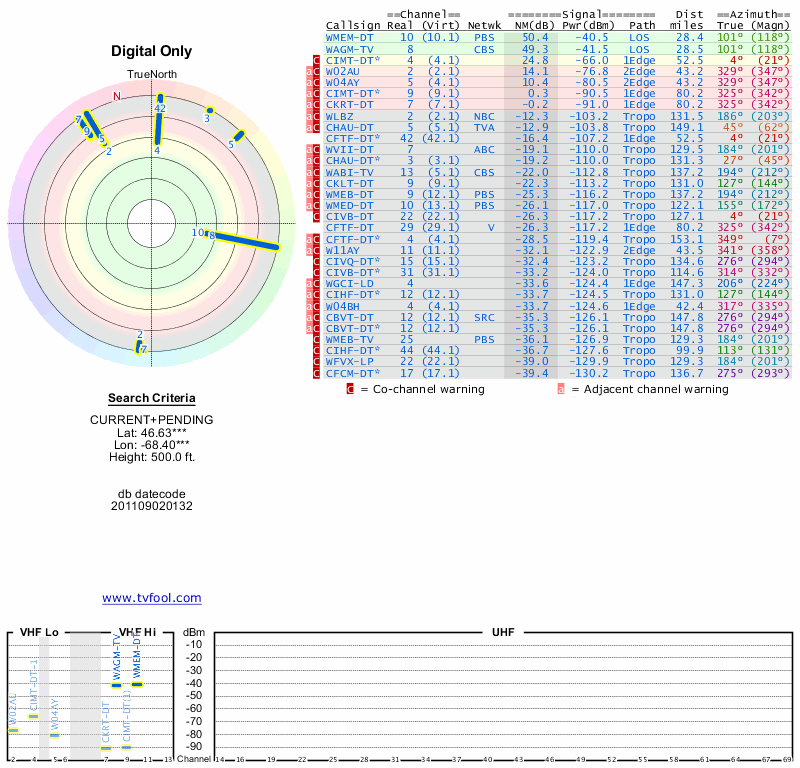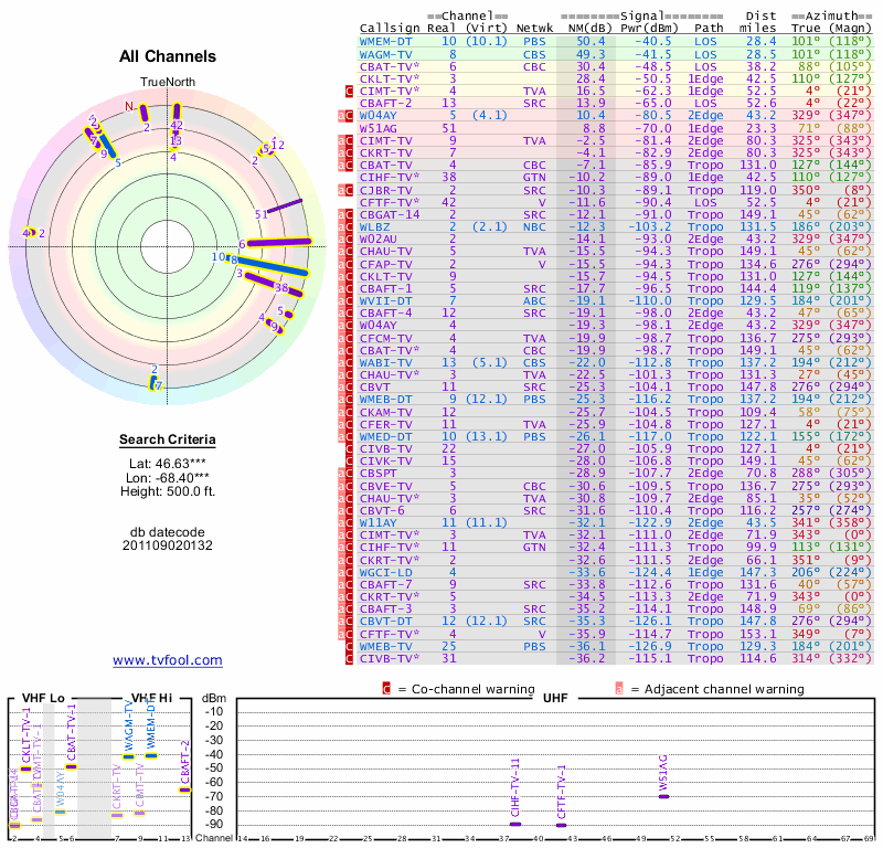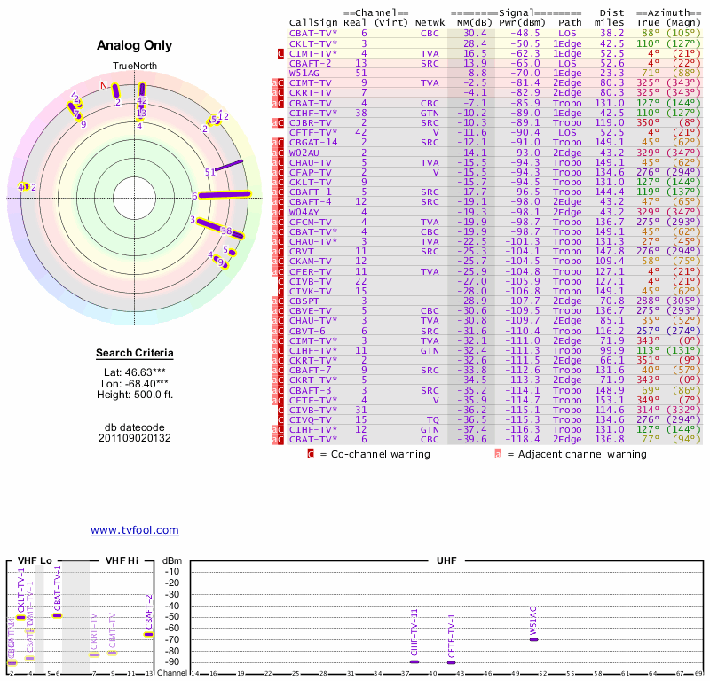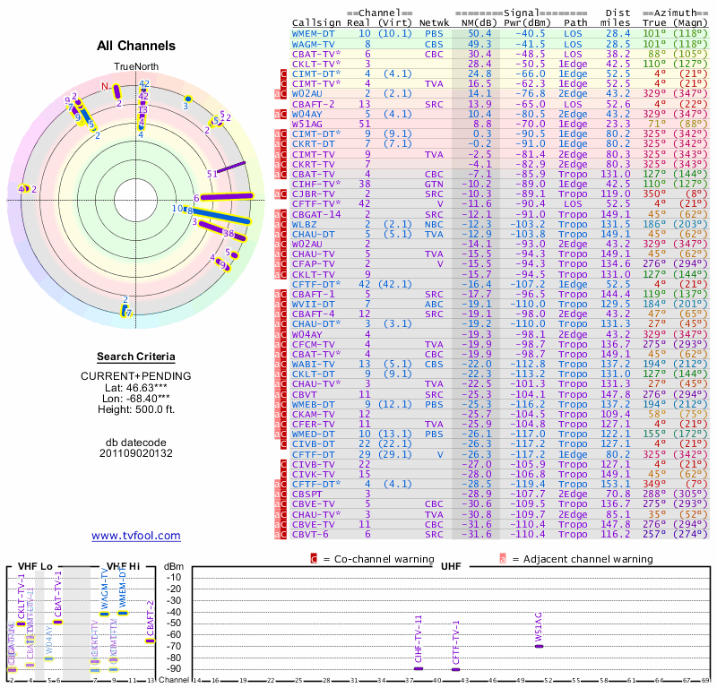 Here are the results for your location. The transmitter database was last updated on June 7, 2013. For more information about these plots and how to interpret them, please check out the Signal Analysis FAQ.