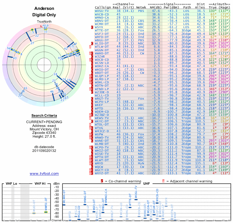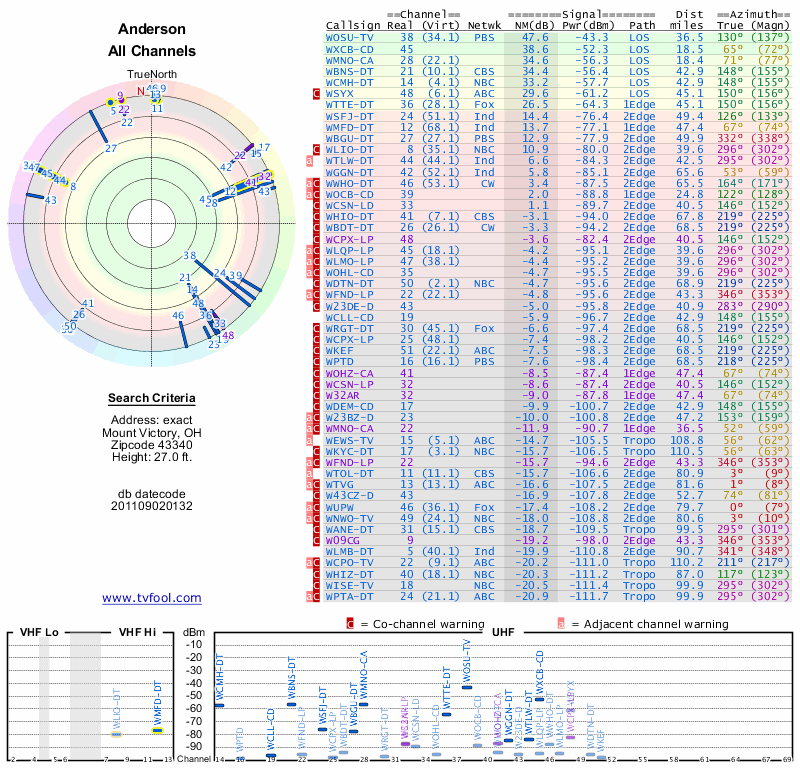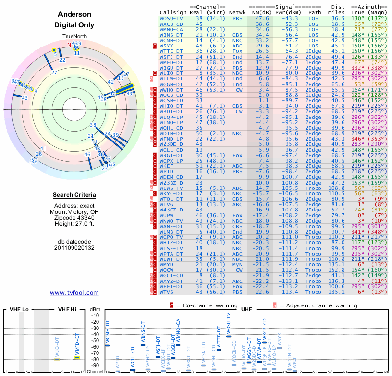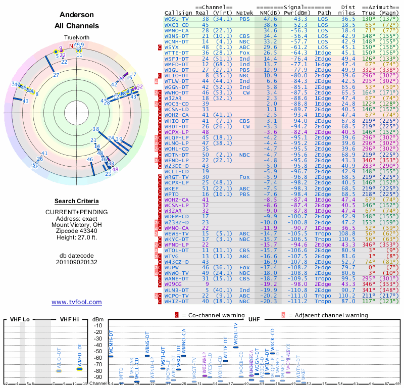 Here are the results for your location. The transmitter database was last updated on June 7, 2013. For more information about these plots and how to interpret them, please check out the Signal Analysis FAQ.