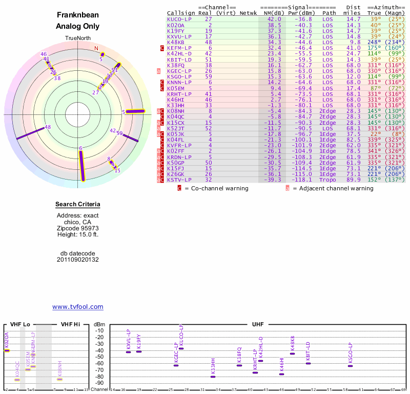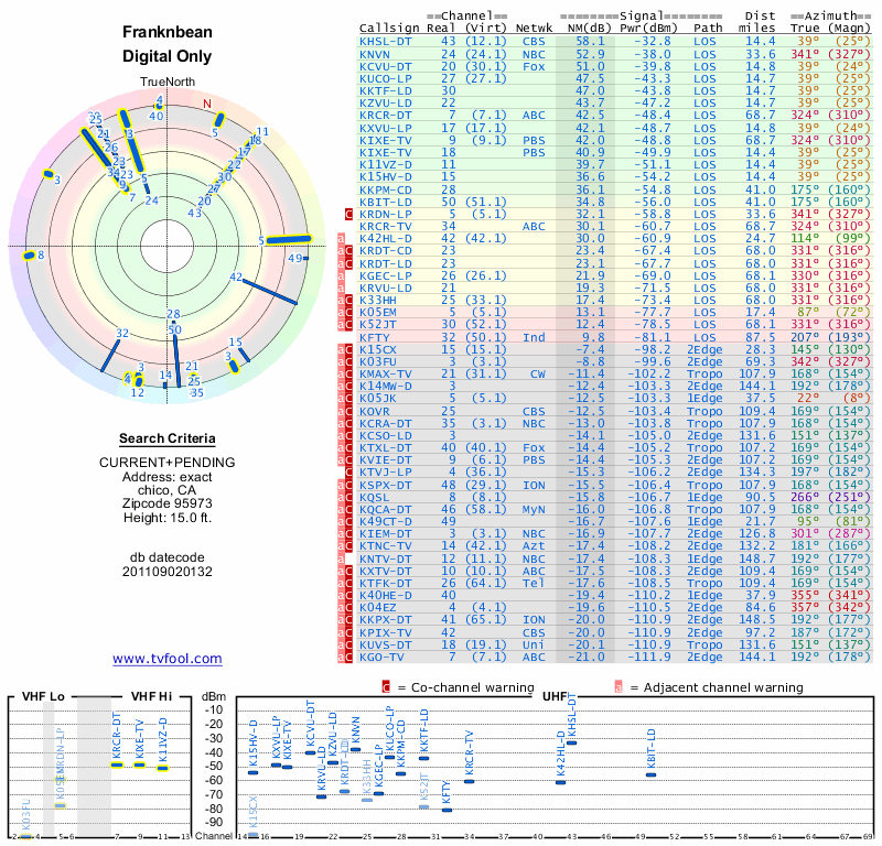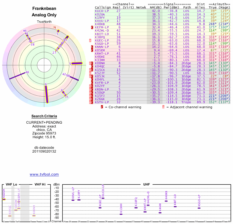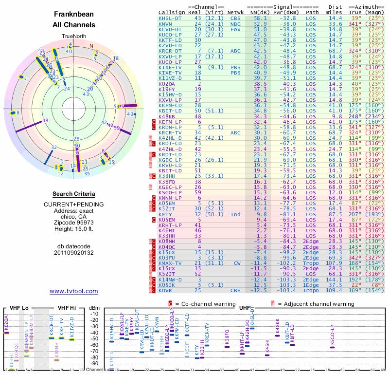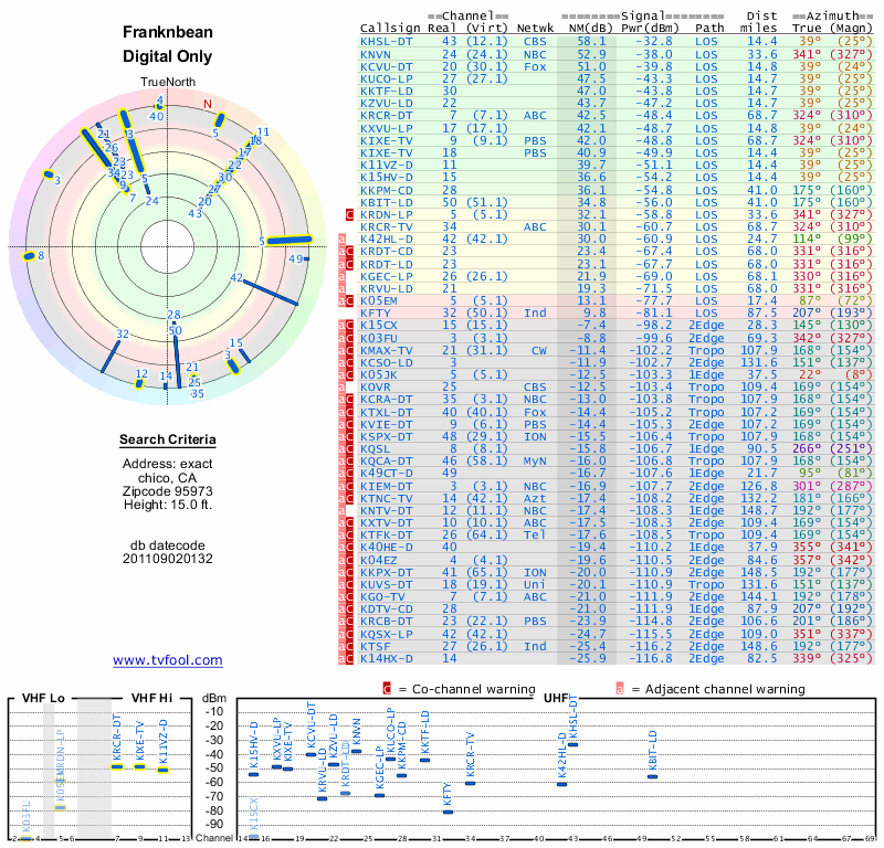 Here are the results for your location. The transmitter database was last updated on June 7, 2013. For more information about these plots and how to interpret them, please check out the Signal Analysis FAQ.