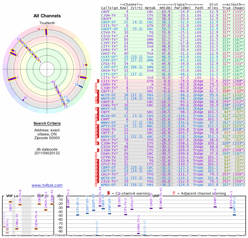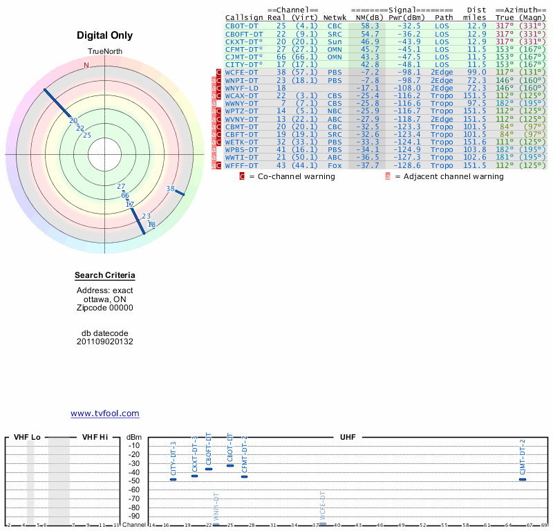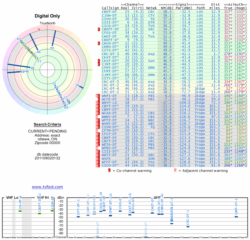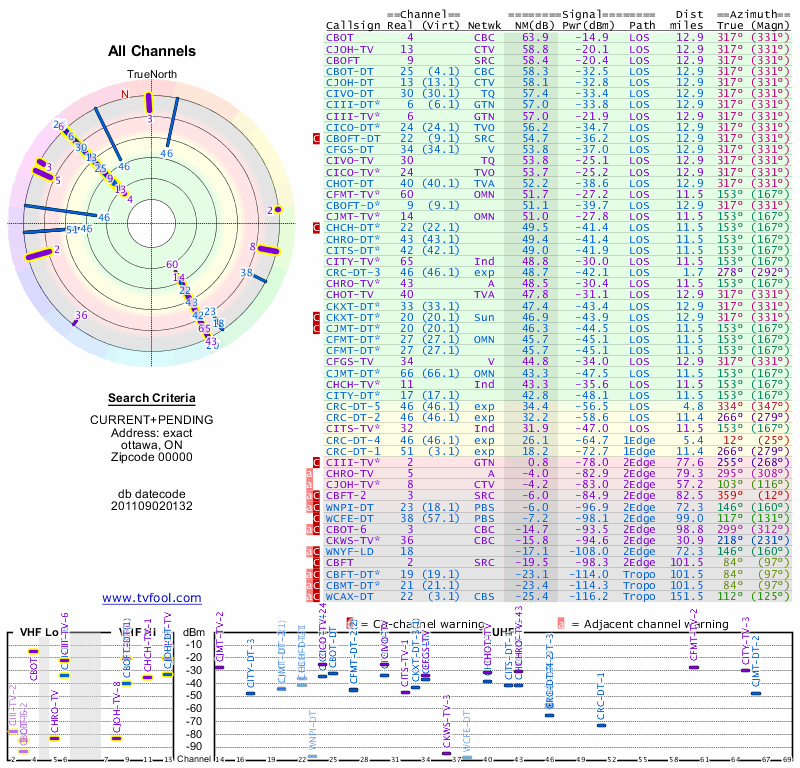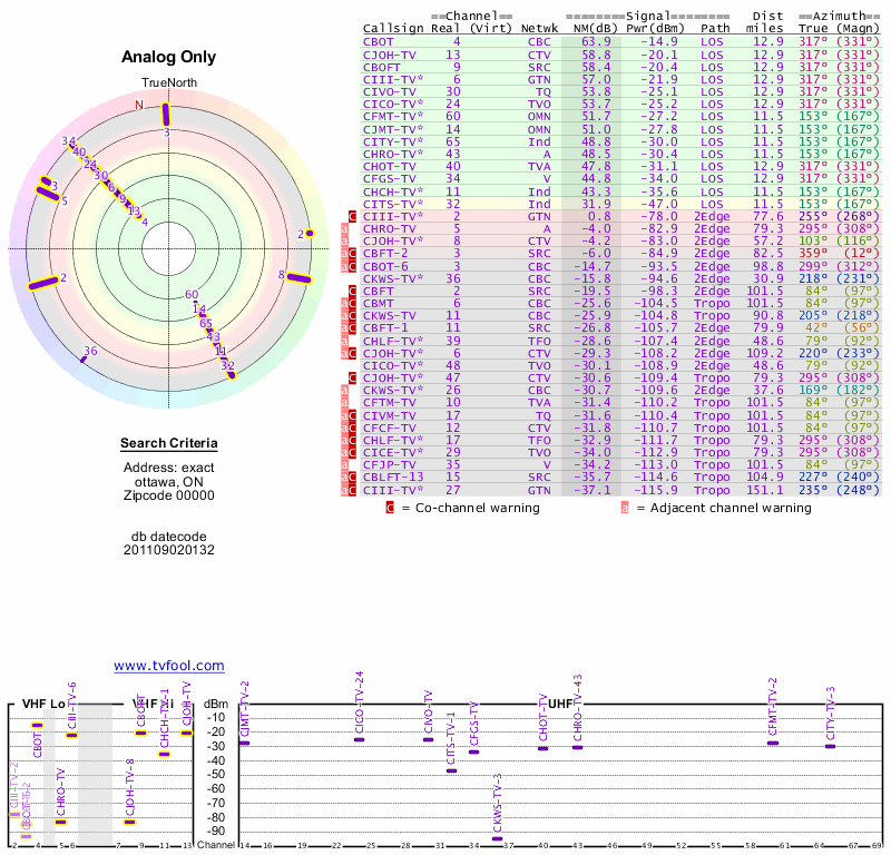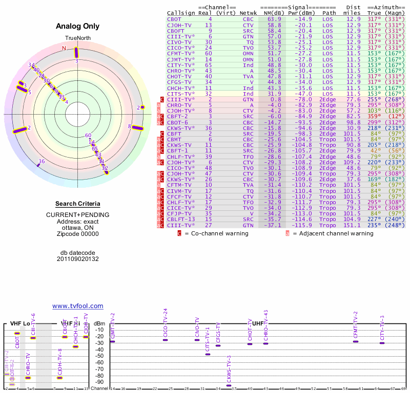 Here are the results for your location. The transmitter database was last updated on June 7, 2013. For more information about these plots and how to interpret them, please check out the Signal Analysis FAQ.