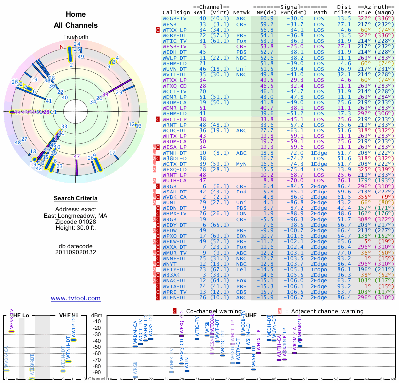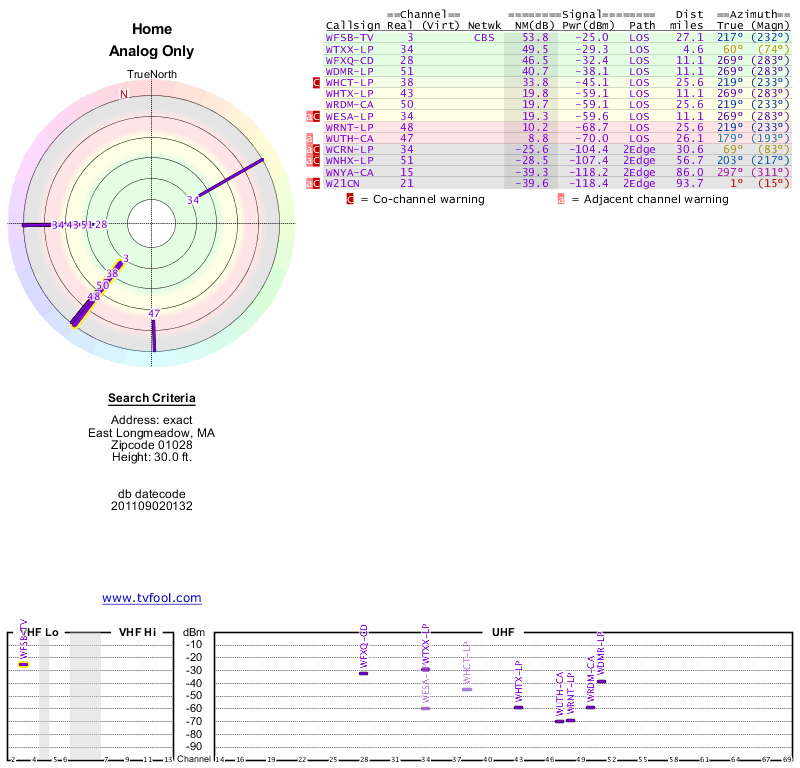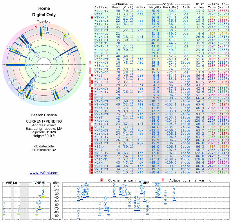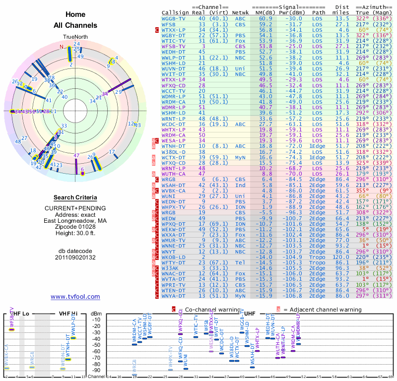 Here are the results for your location. The transmitter database was last updated on June 7, 2013. For more information about these plots and how to interpret them, please check out the Signal Analysis FAQ.