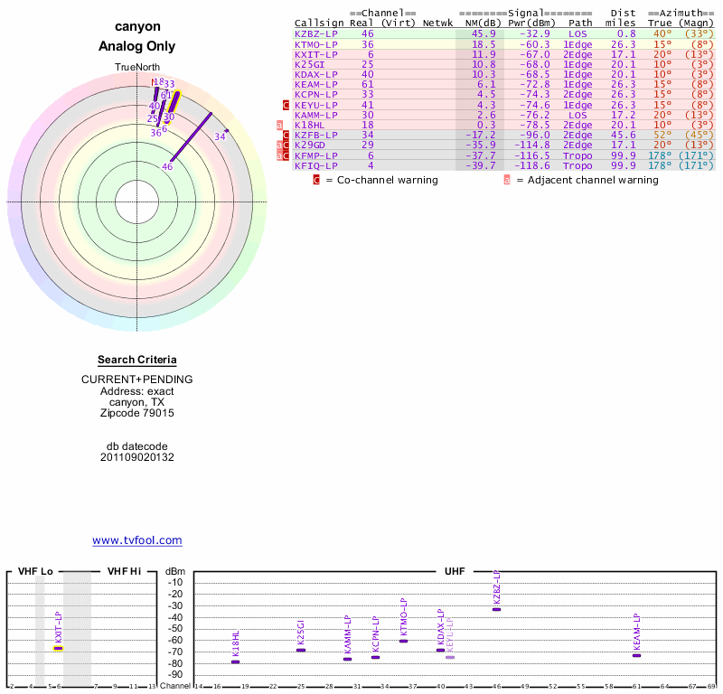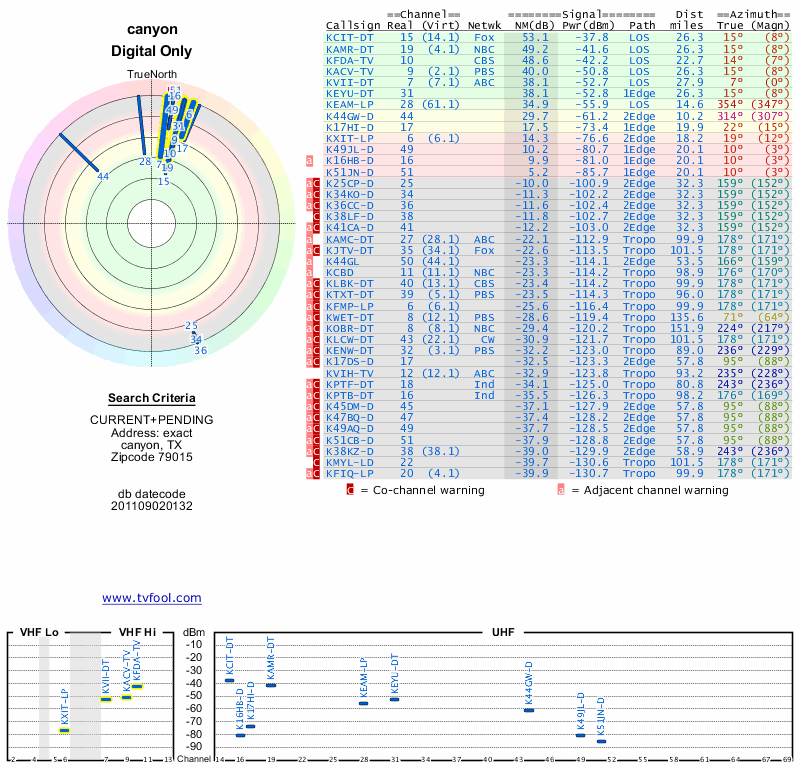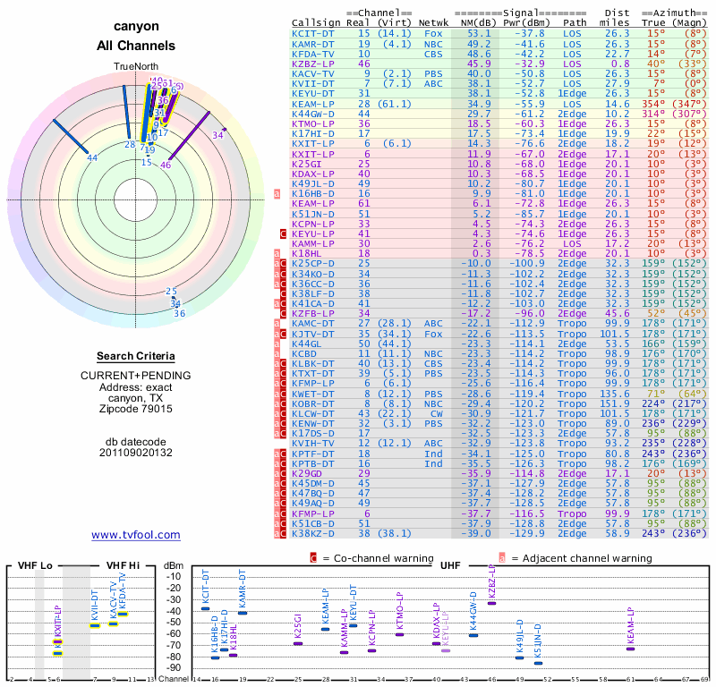 Here are the results for your location. The transmitter database was last updated on June 7, 2013. For more information about these plots and how to interpret them, please check out the Signal Analysis FAQ.