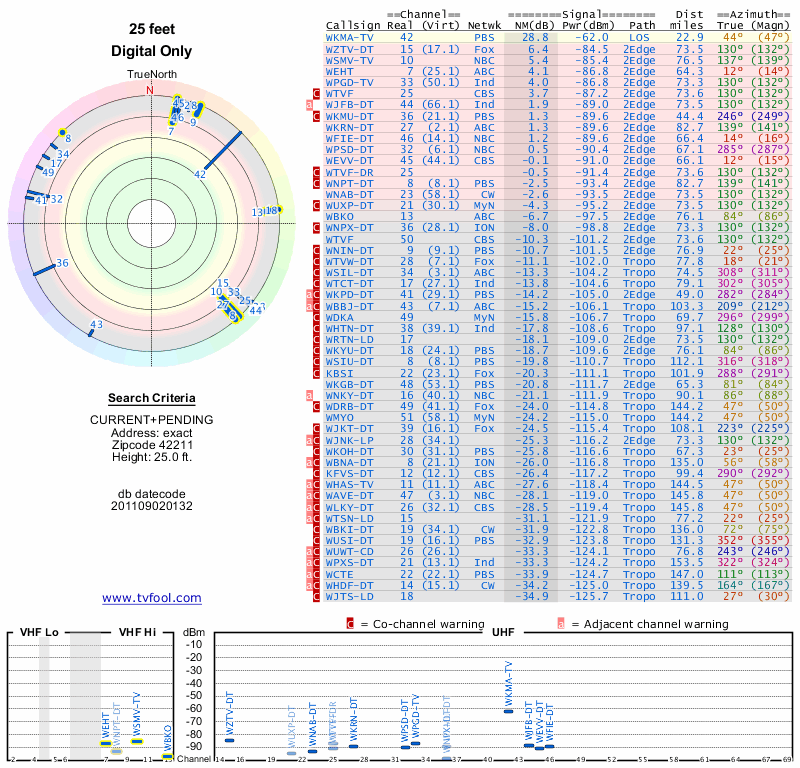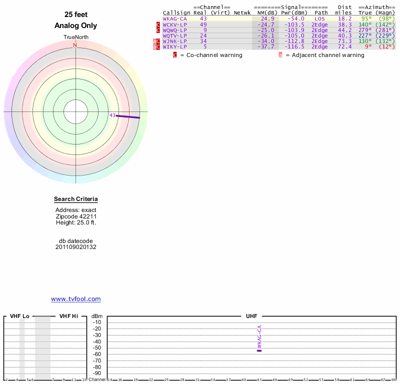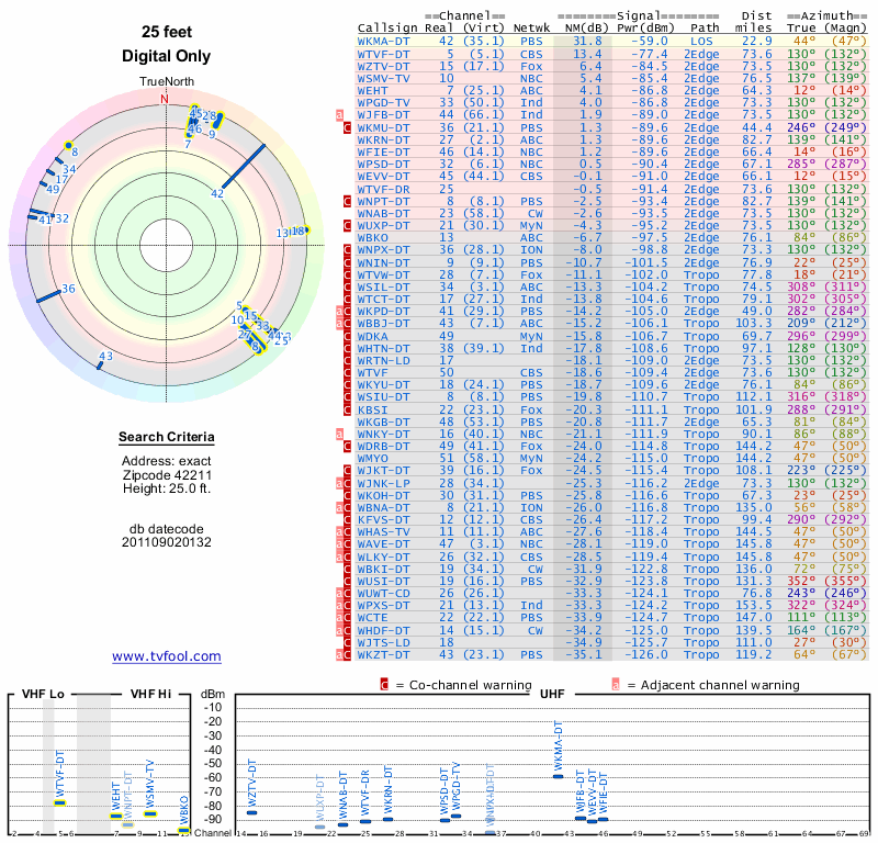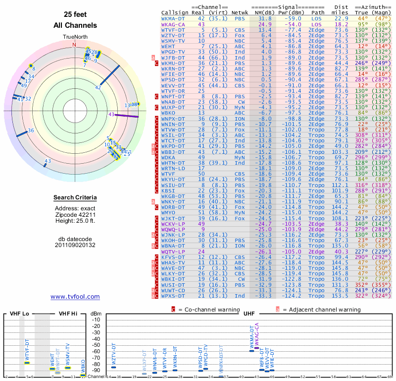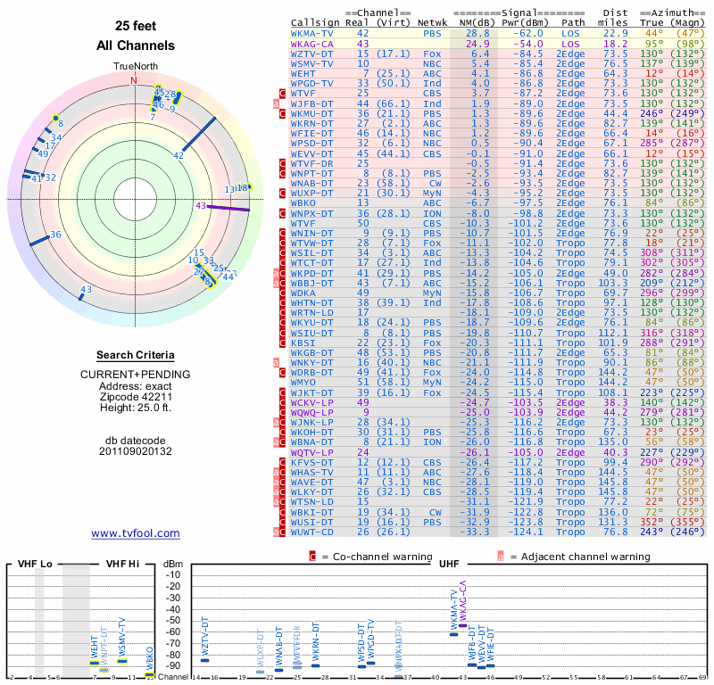 Here are the results for your location. The transmitter database was last updated on June 7, 2013. For more information about these plots and how to interpret them, please check out the Signal Analysis FAQ.