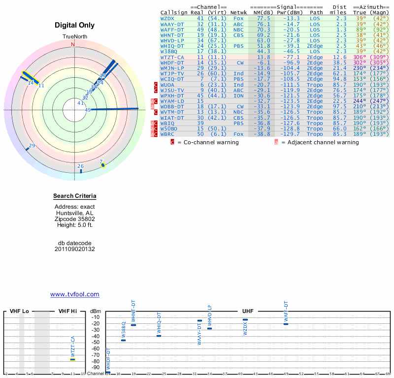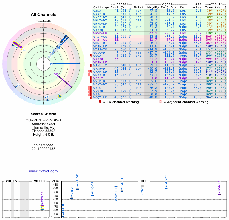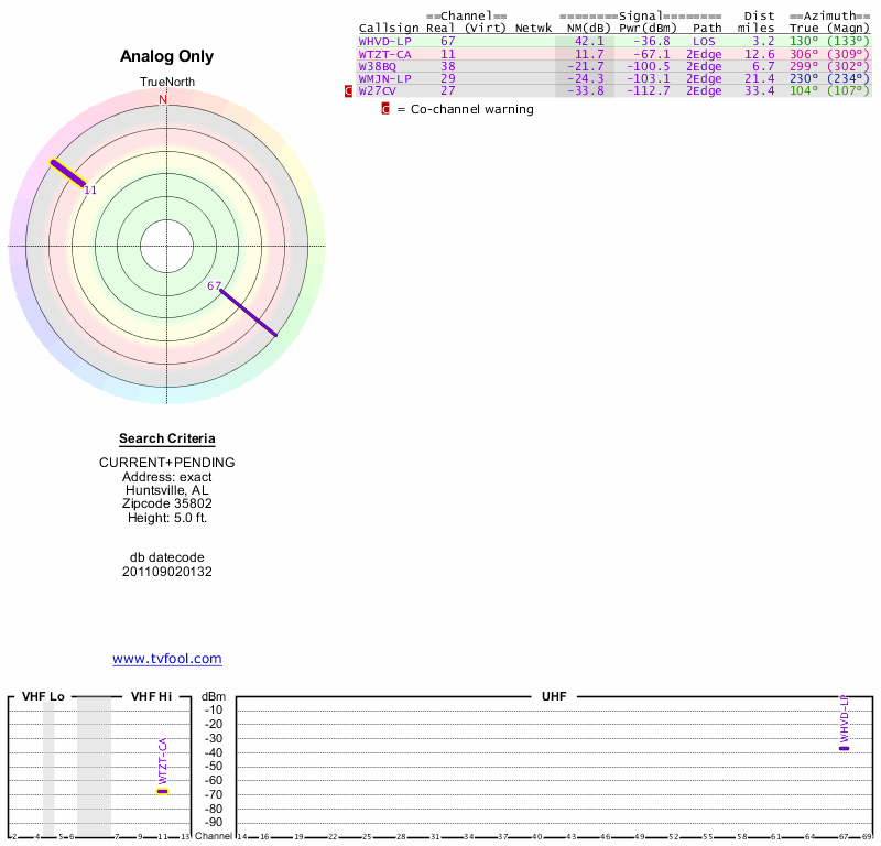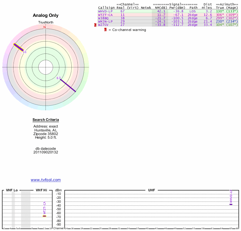 Here are the results for your location. The transmitter database was last updated on June 7, 2013. For more information about these plots and how to interpret them, please check out the Signal Analysis FAQ.