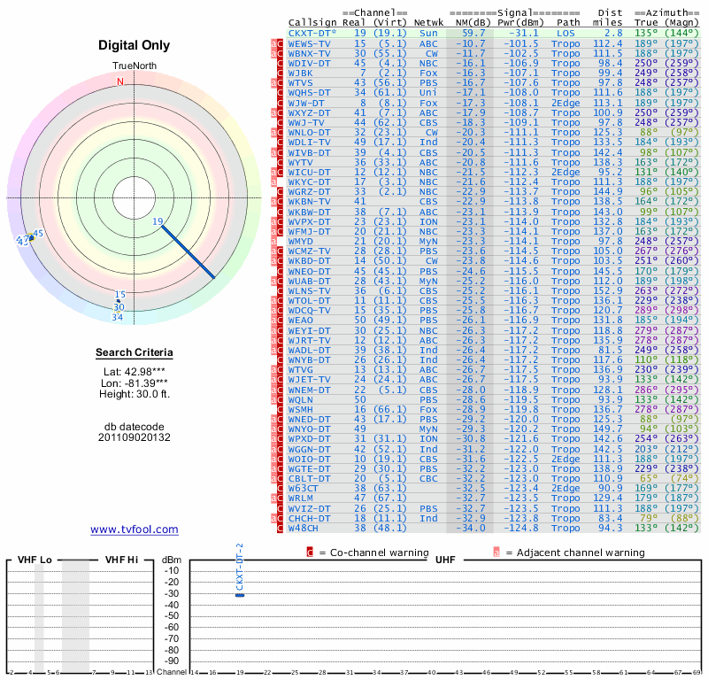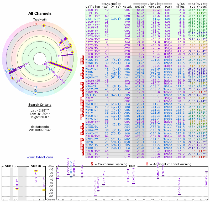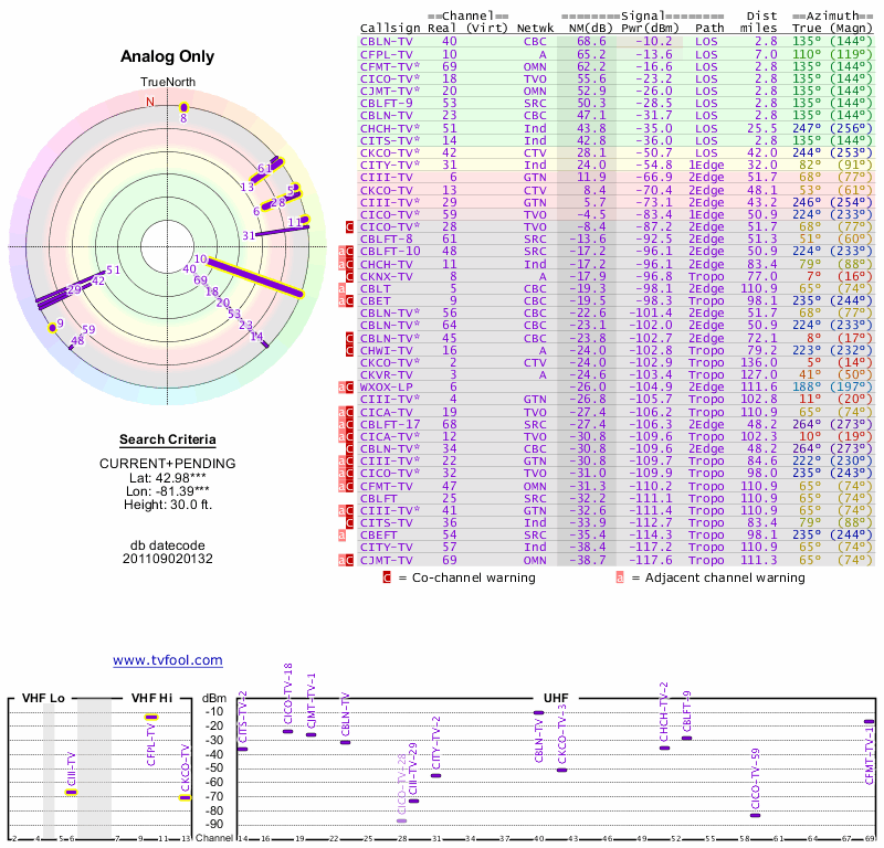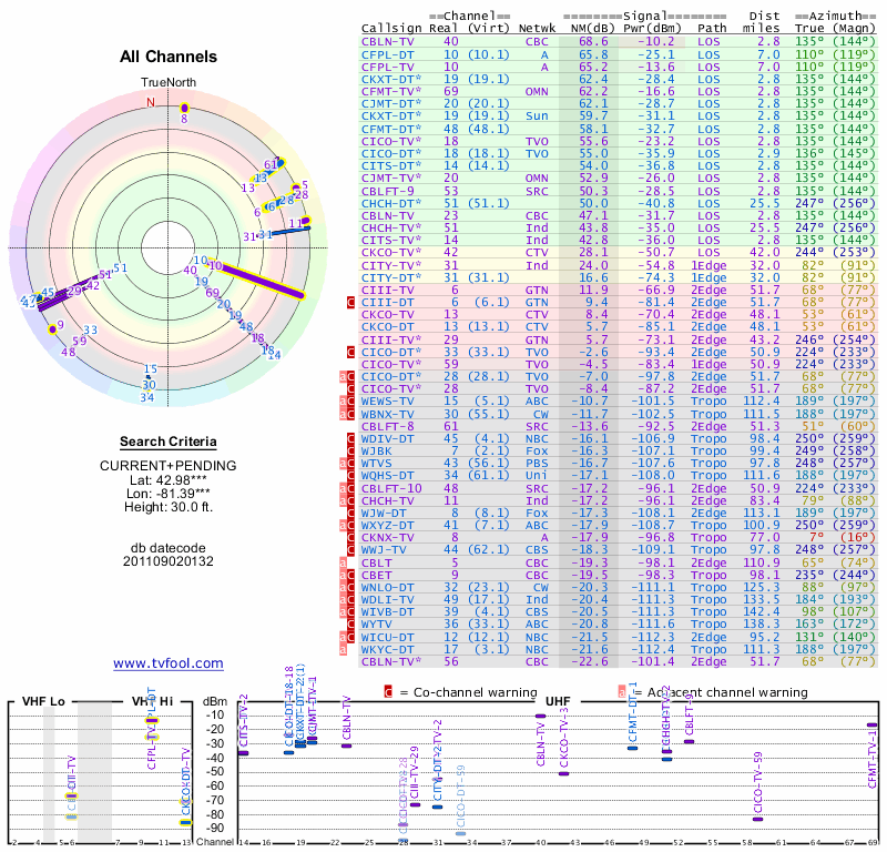 Here are the results for your location. The transmitter database was last updated on June 7, 2013. For more information about these plots and how to interpret them, please check out the Signal Analysis FAQ.