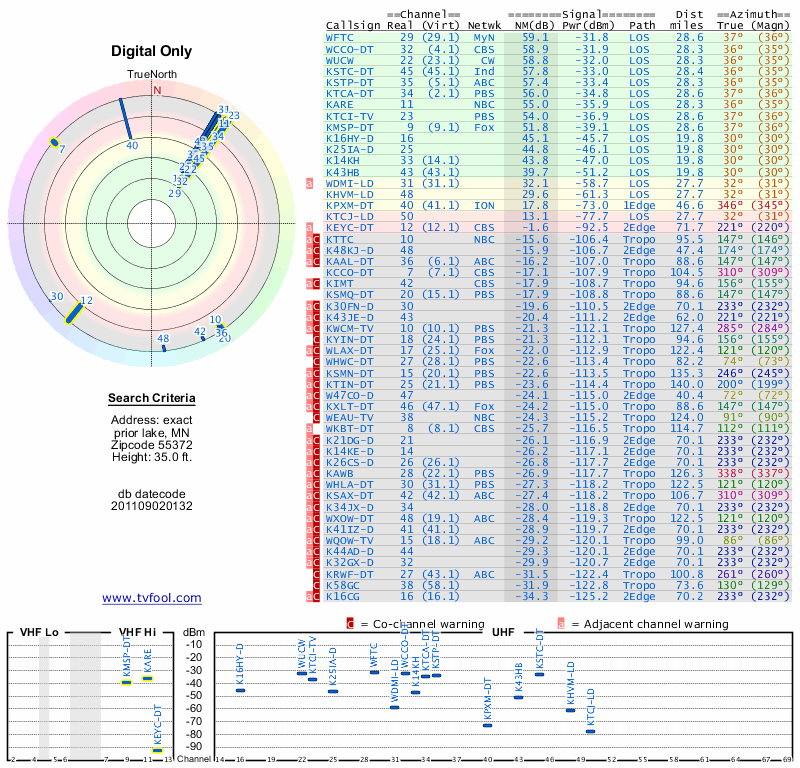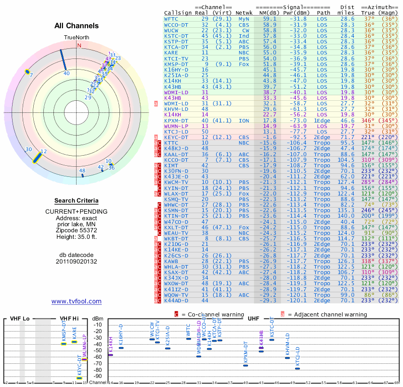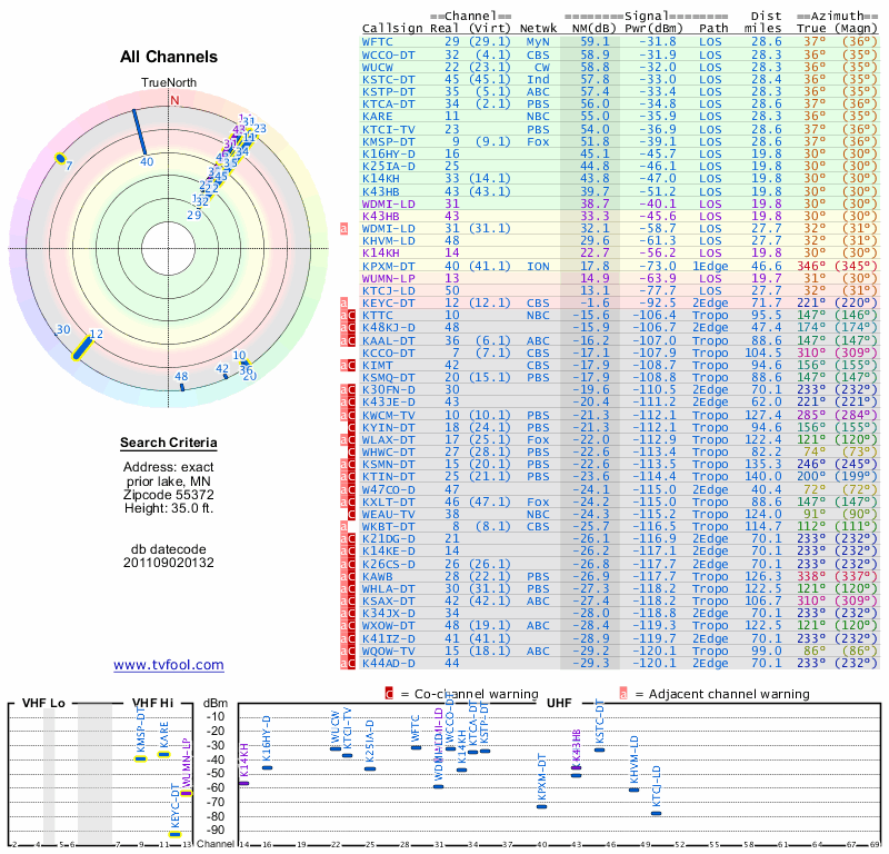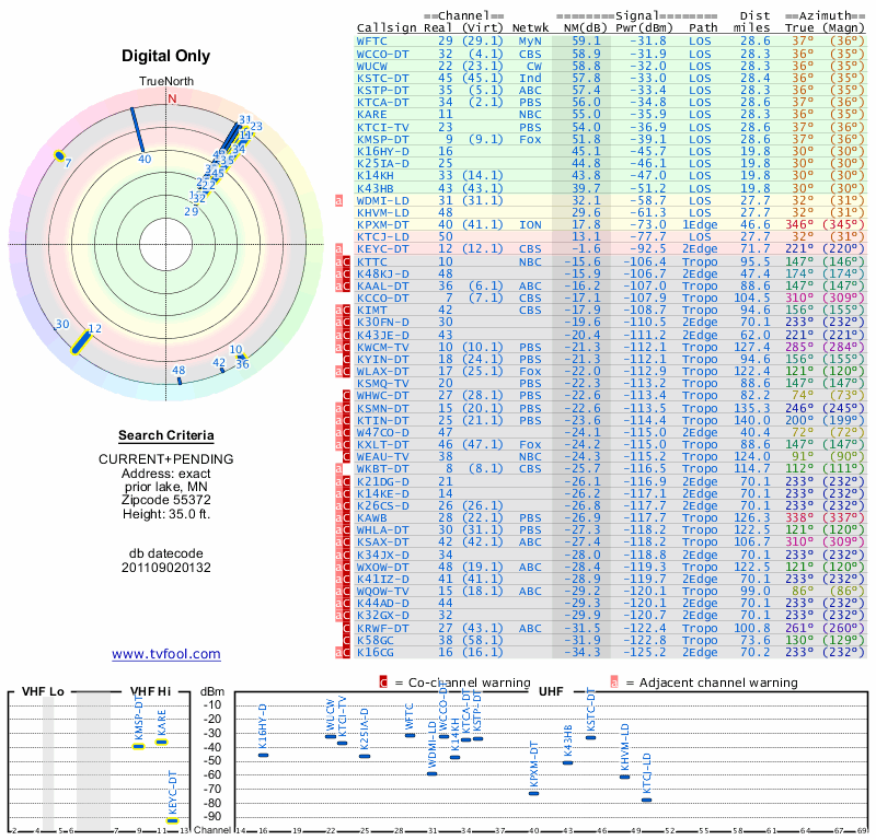 Here are the results for your location. The transmitter database was last updated on June 7, 2013. For more information about these plots and how to interpret them, please check out the Signal Analysis FAQ.