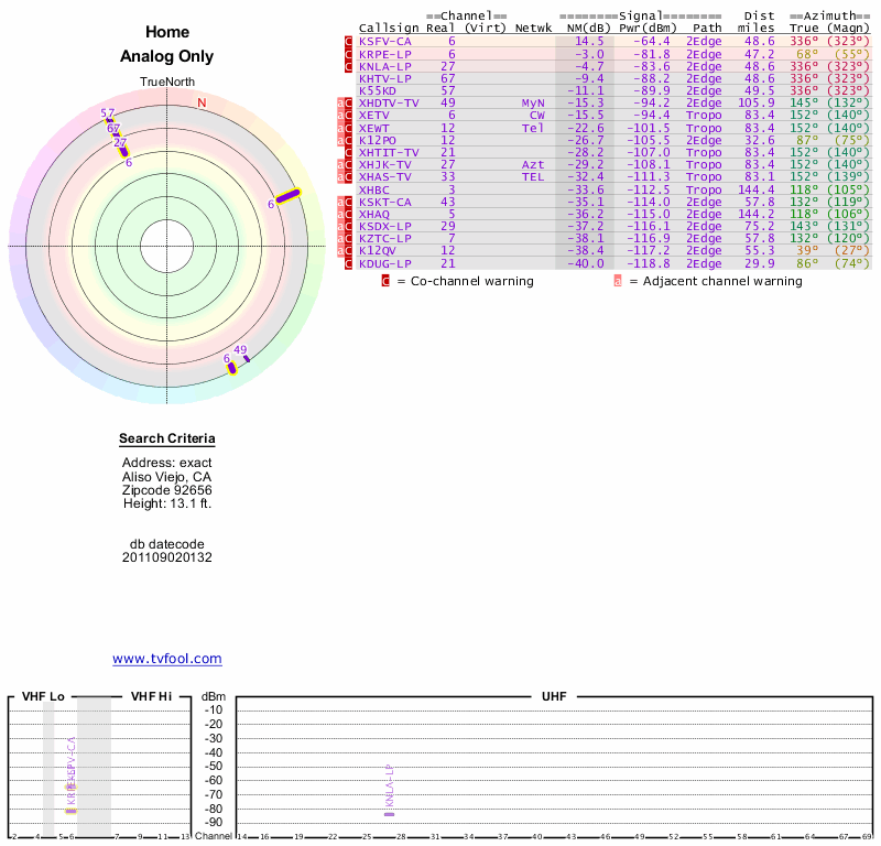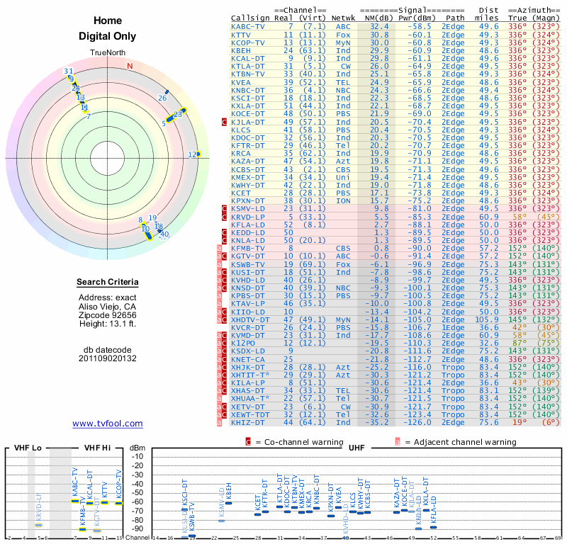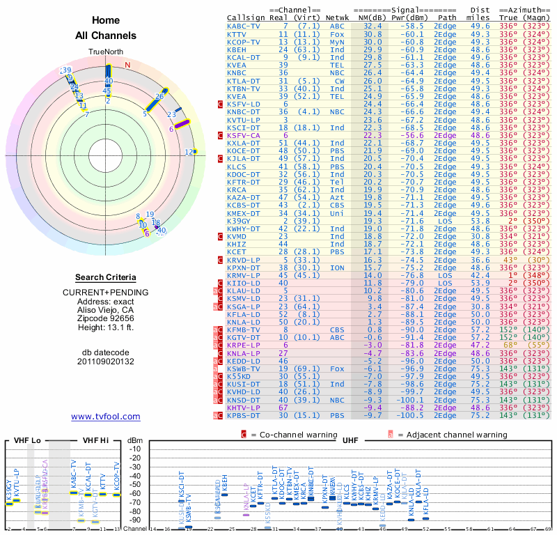 Here are the results for your location. The transmitter database was last updated on June 7, 2013. For more information about these plots and how to interpret them, please check out the Signal Analysis FAQ.