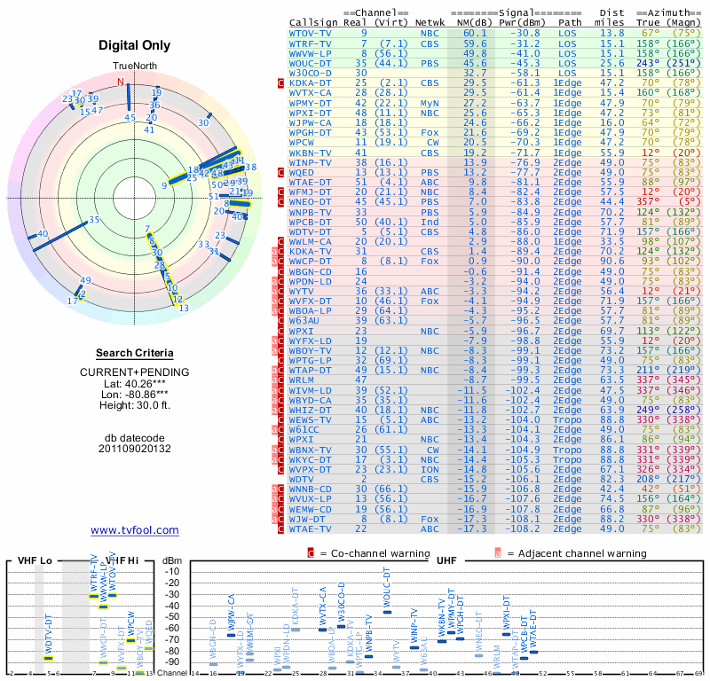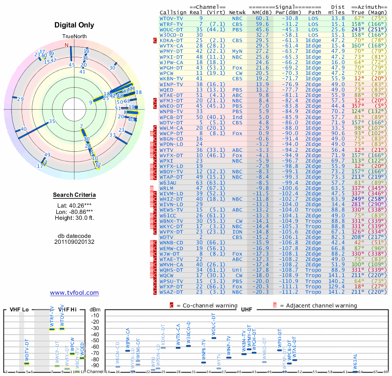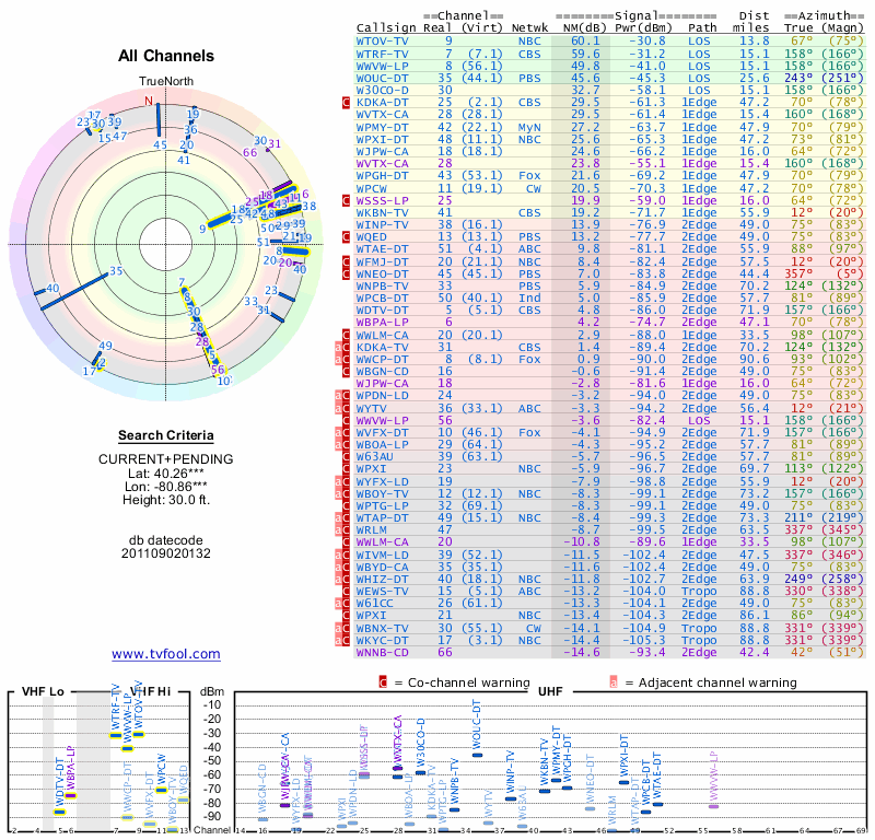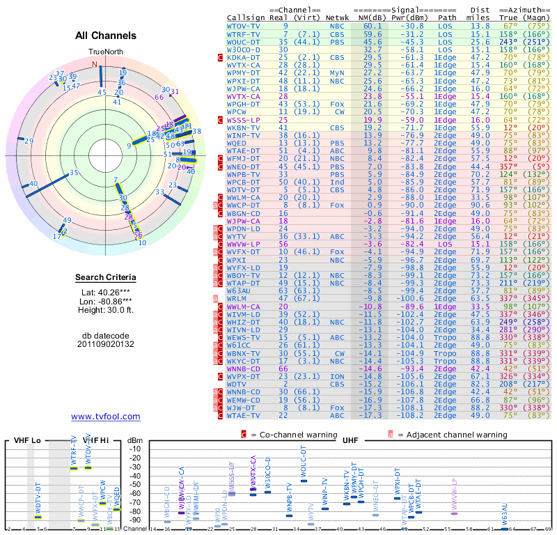 Here are the results for your location. The transmitter database was last updated on June 7, 2013. For more information about these plots and how to interpret them, please check out the Signal Analysis FAQ.