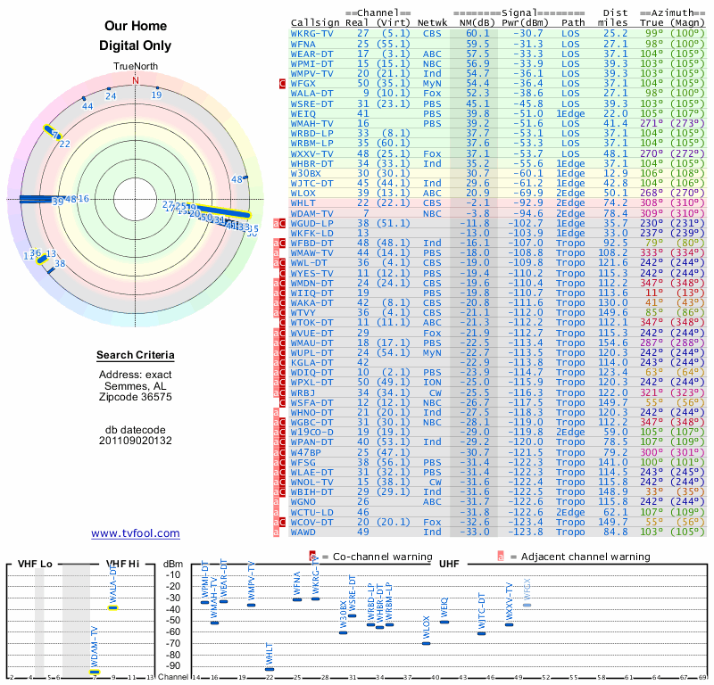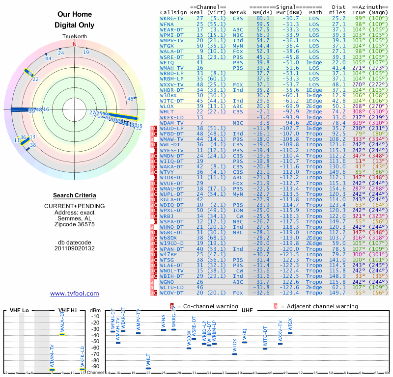 Here are the results for your location. The transmitter database was last updated on June 7, 2013. For more information about these plots and how to interpret them, please check out the Signal Analysis FAQ.