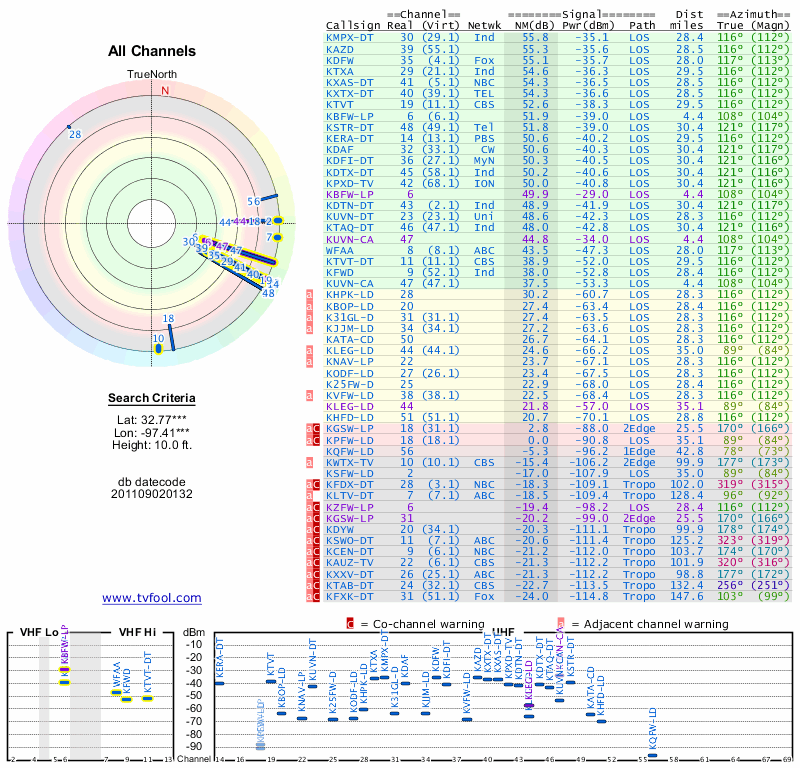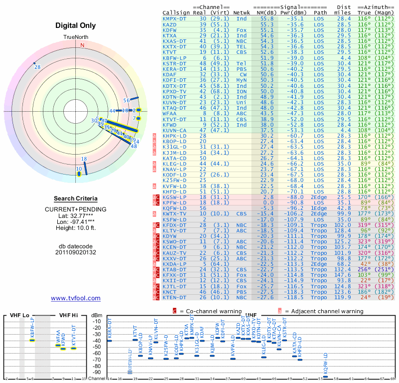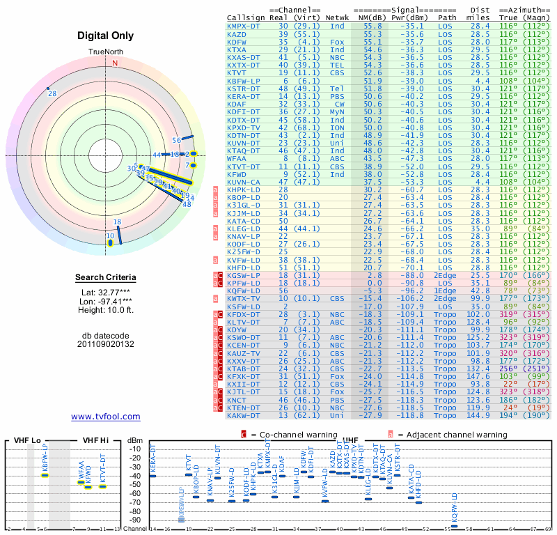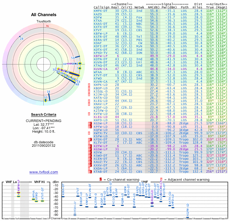 Here are the results for your location. The transmitter database was last updated on June 7, 2013. For more information about these plots and how to interpret them, please check out the Signal Analysis FAQ.