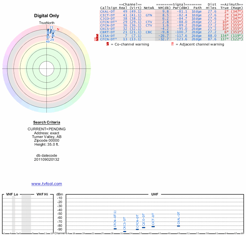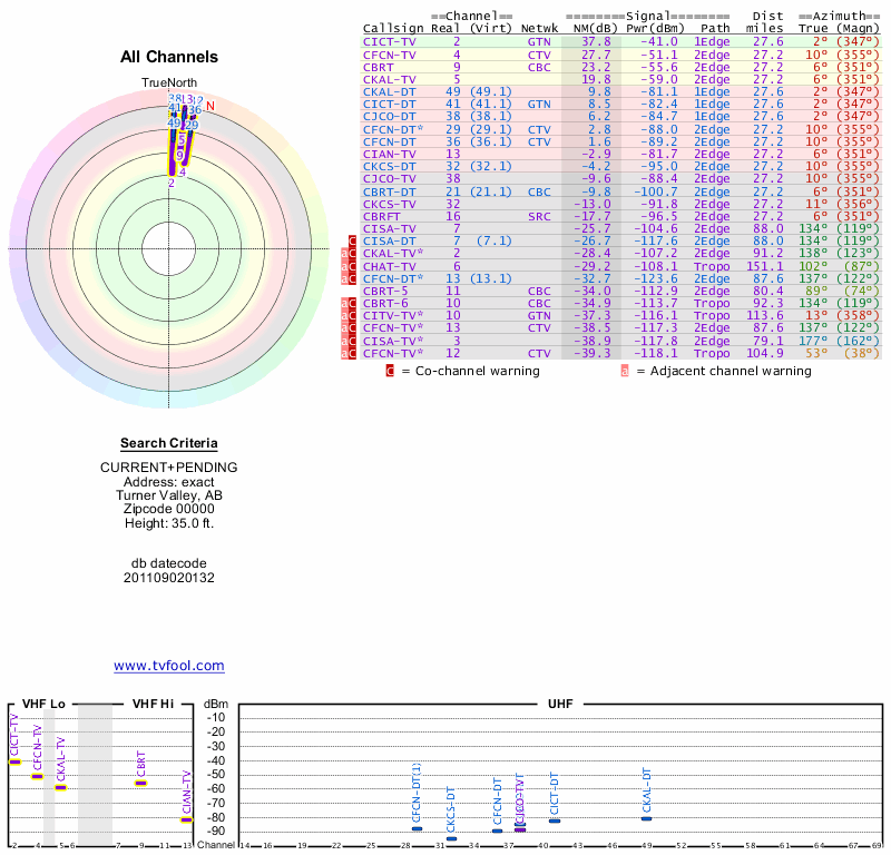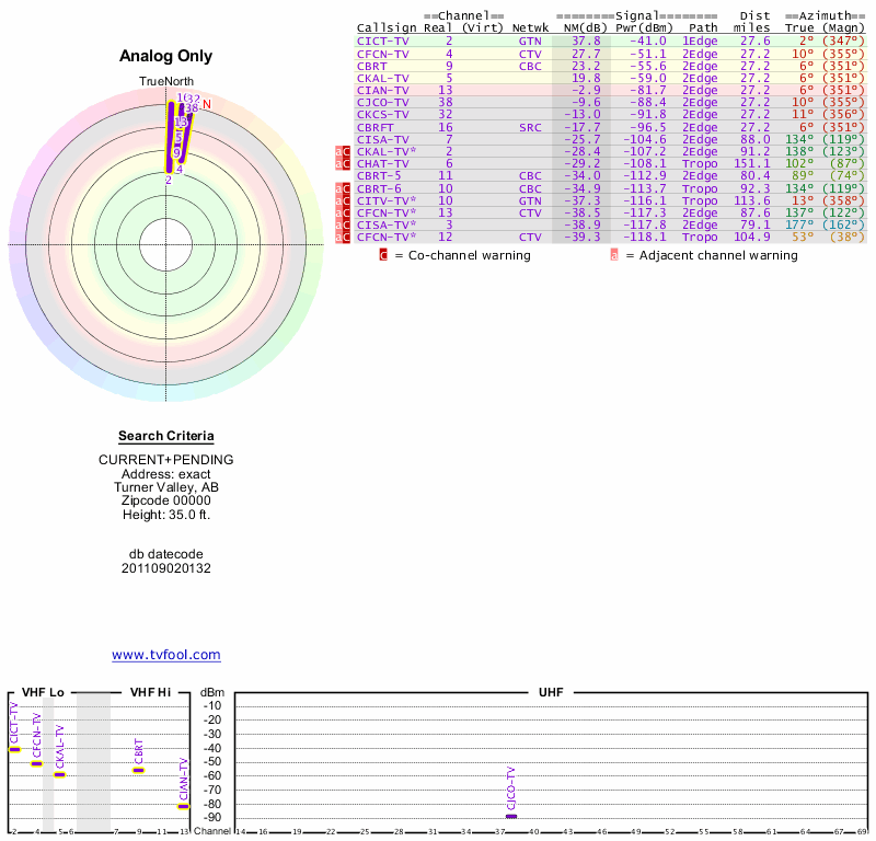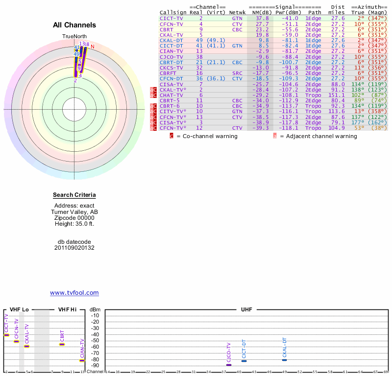 Here are the results for your location. The transmitter database was last updated on June 7, 2013. For more information about these plots and how to interpret them, please check out the Signal Analysis FAQ.