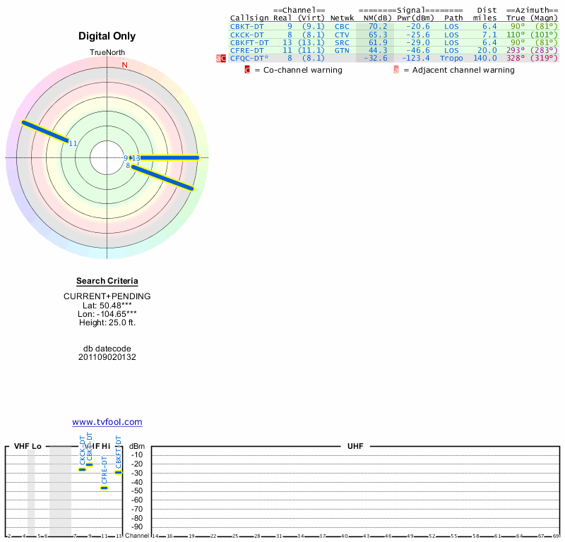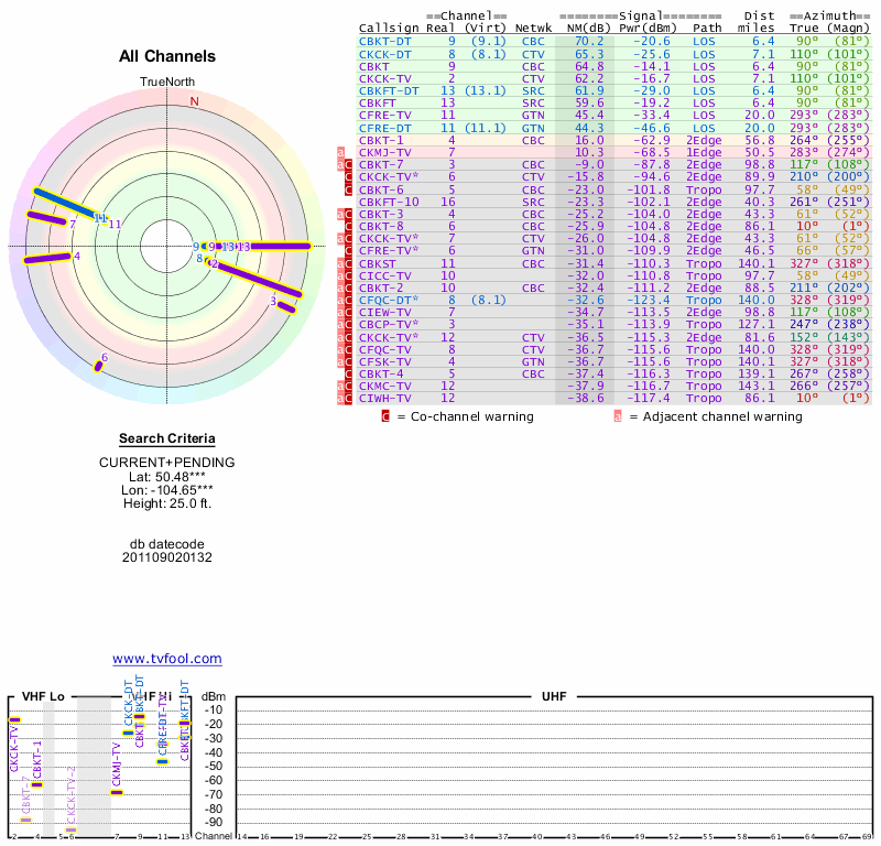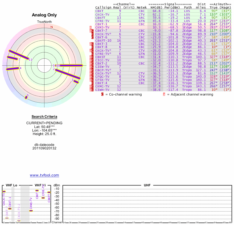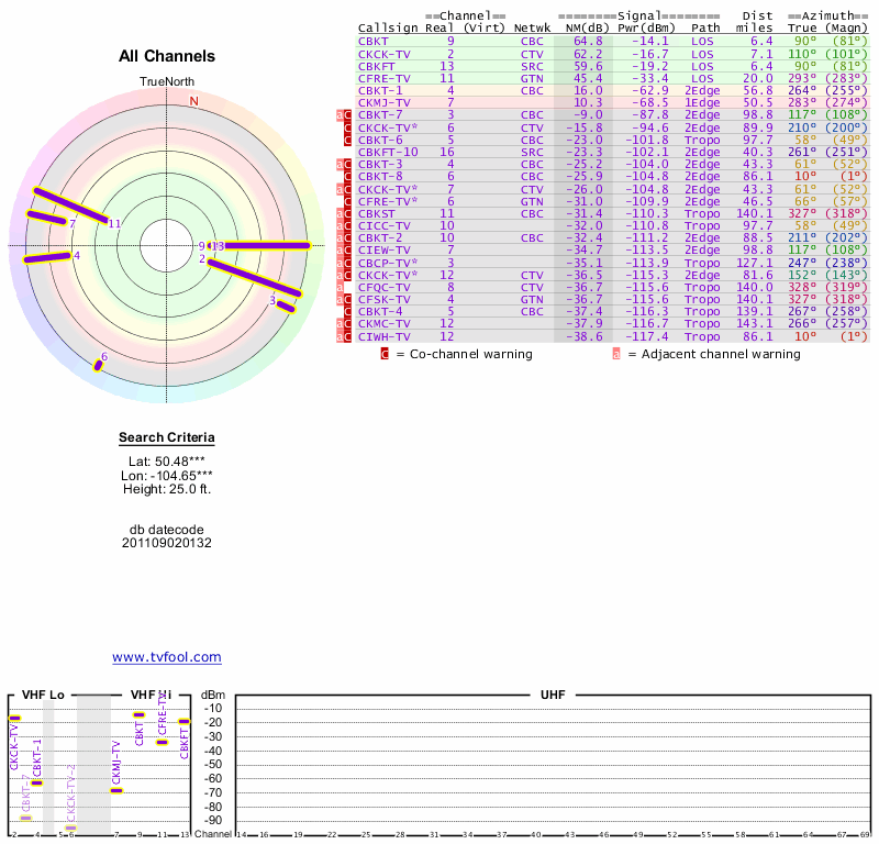 Here are the results for your location. The transmitter database was last updated on June 7, 2013. For more information about these plots and how to interpret them, please check out the Signal Analysis FAQ.