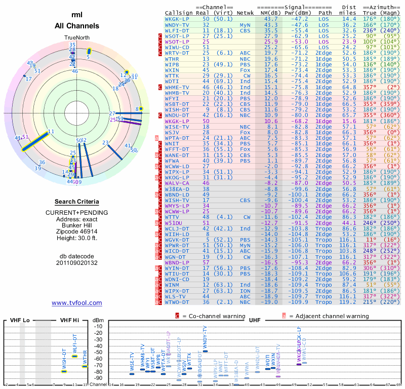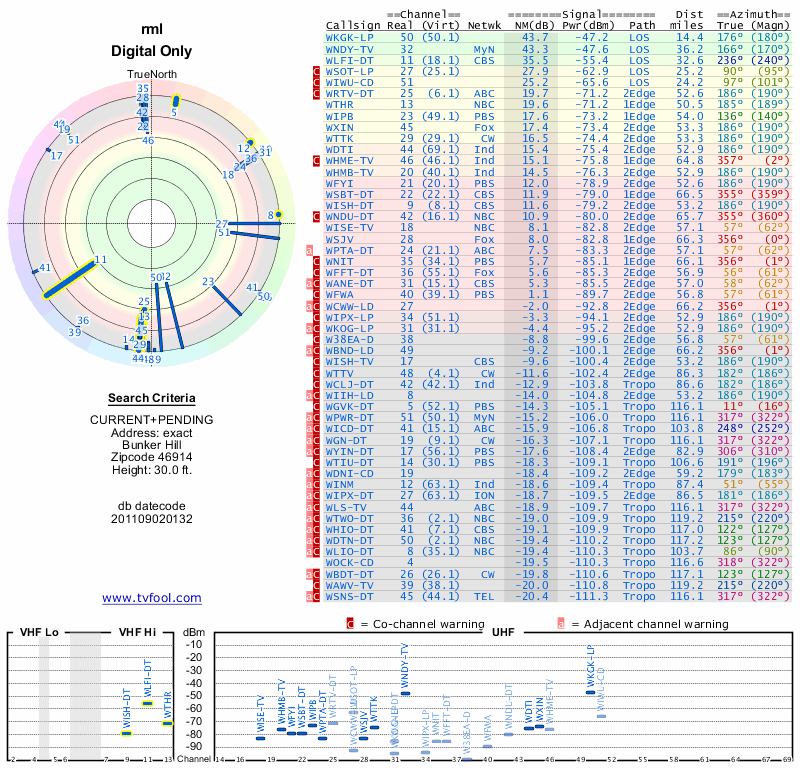Here are the results for your location. The transmitter database was last updated on June 7, 2013. For more information about these plots and how to interpret them, please check out the Signal Analysis FAQ.