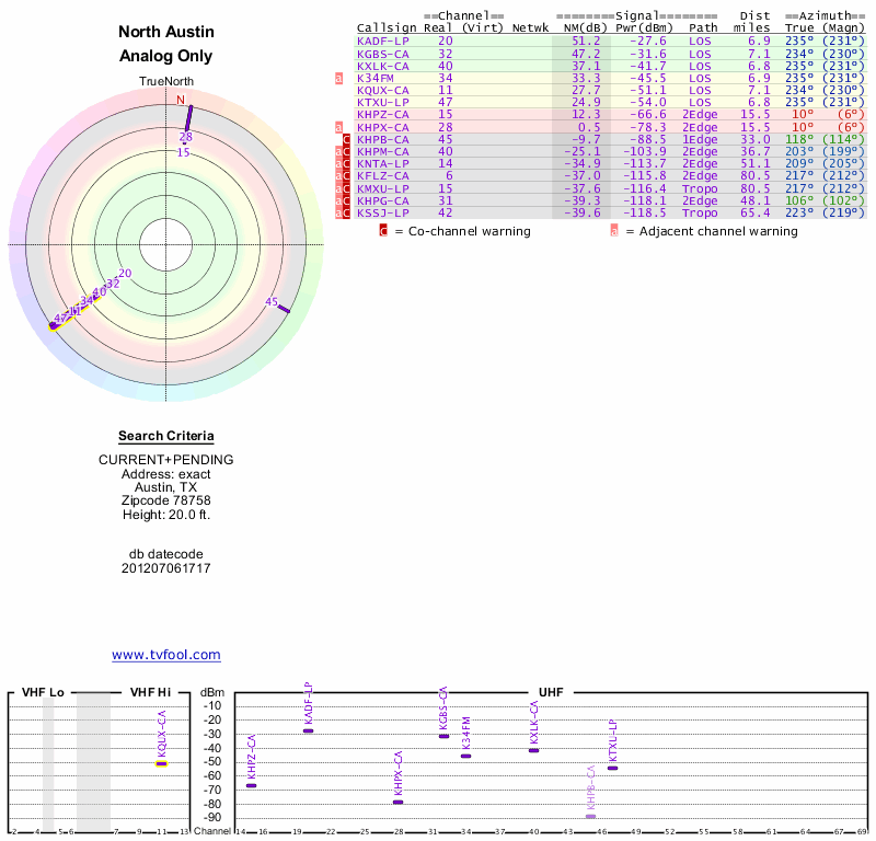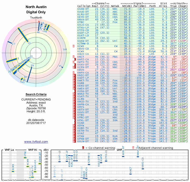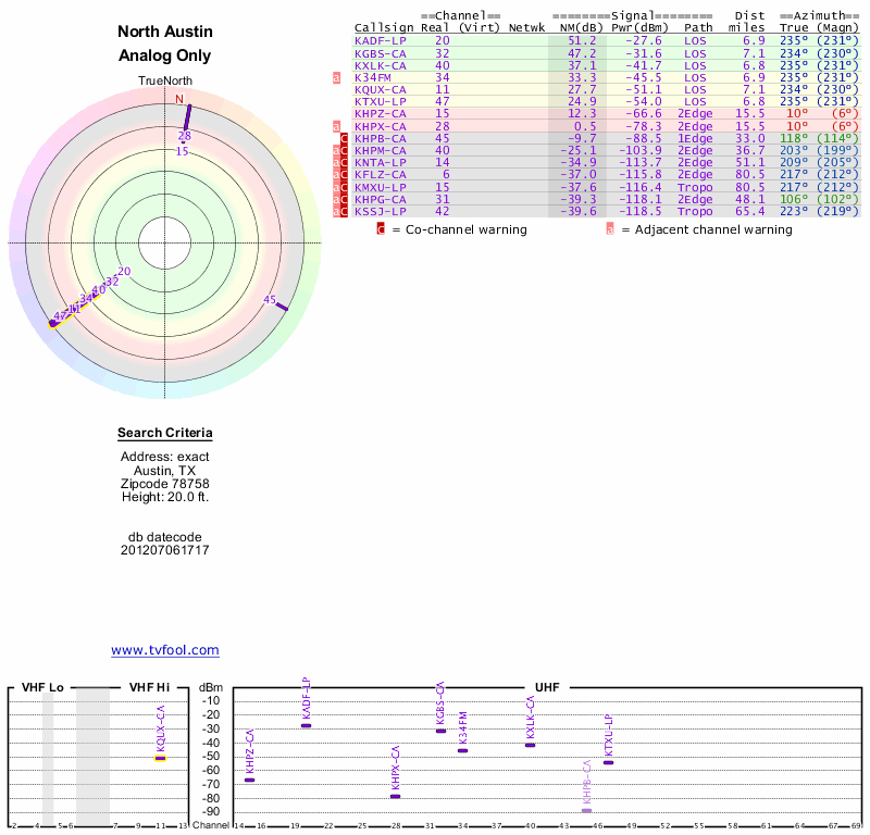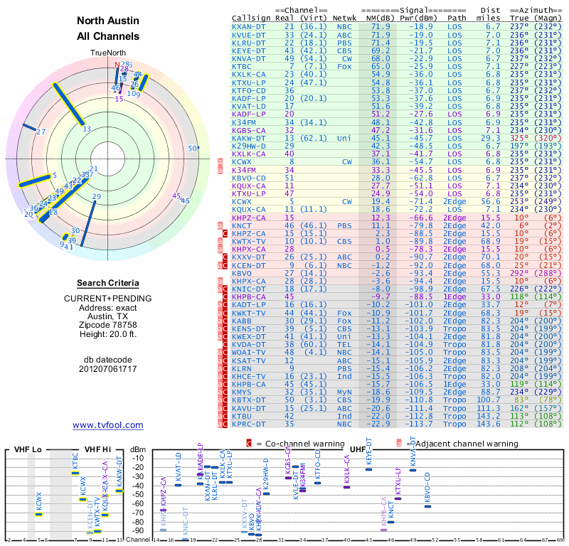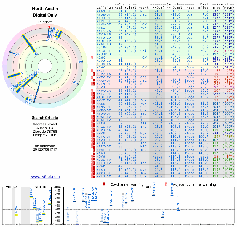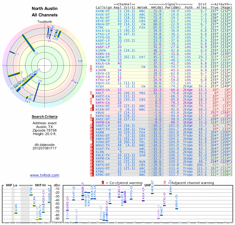 Here are the results for your location. The transmitter database was last updated on June 7, 2013. For more information about these plots and how to interpret them, please check out the Signal Analysis FAQ.