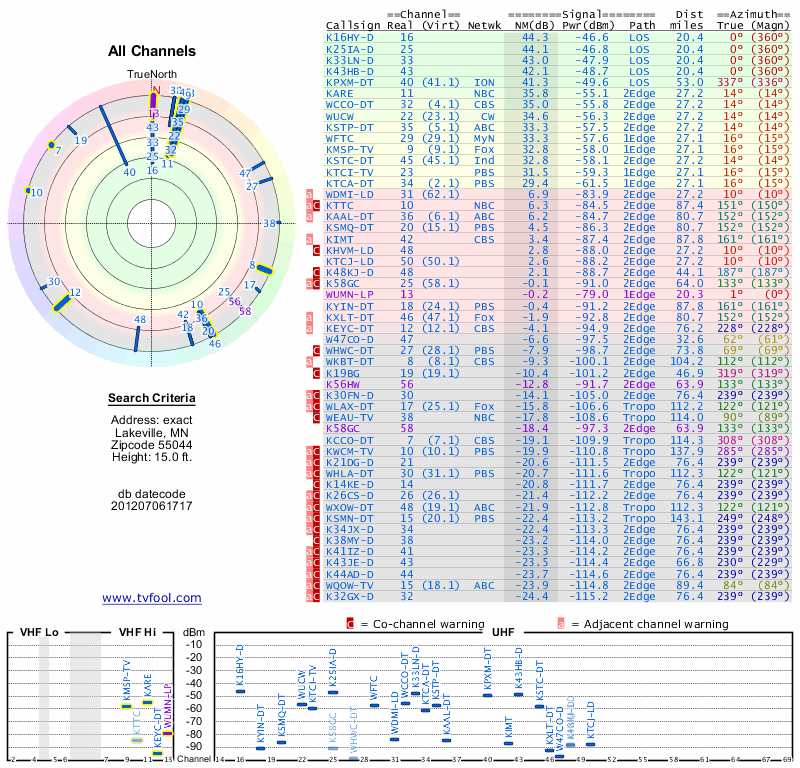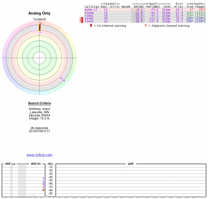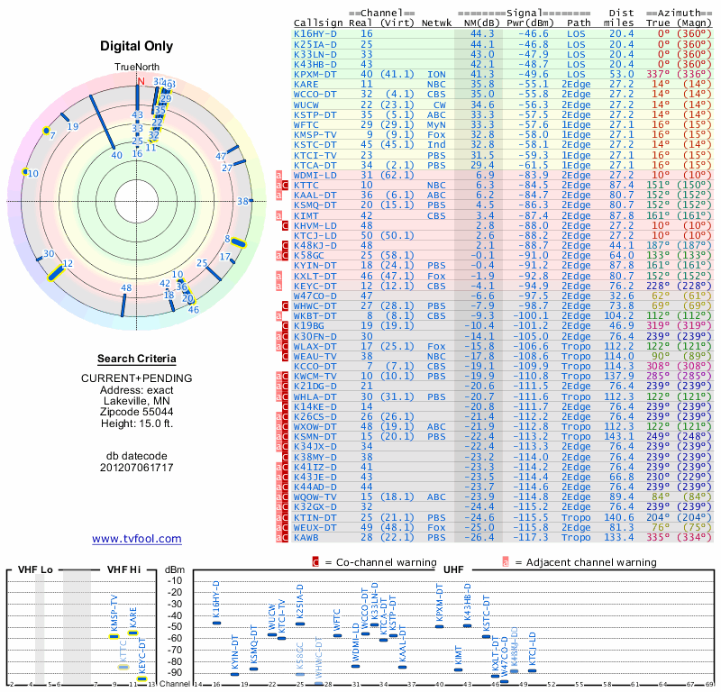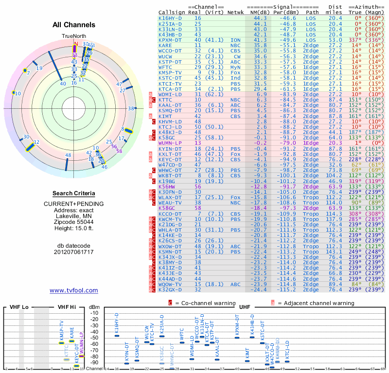 Here are the results for your location. The transmitter database was last updated on June 7, 2013. For more information about these plots and how to interpret them, please check out the Signal Analysis FAQ.