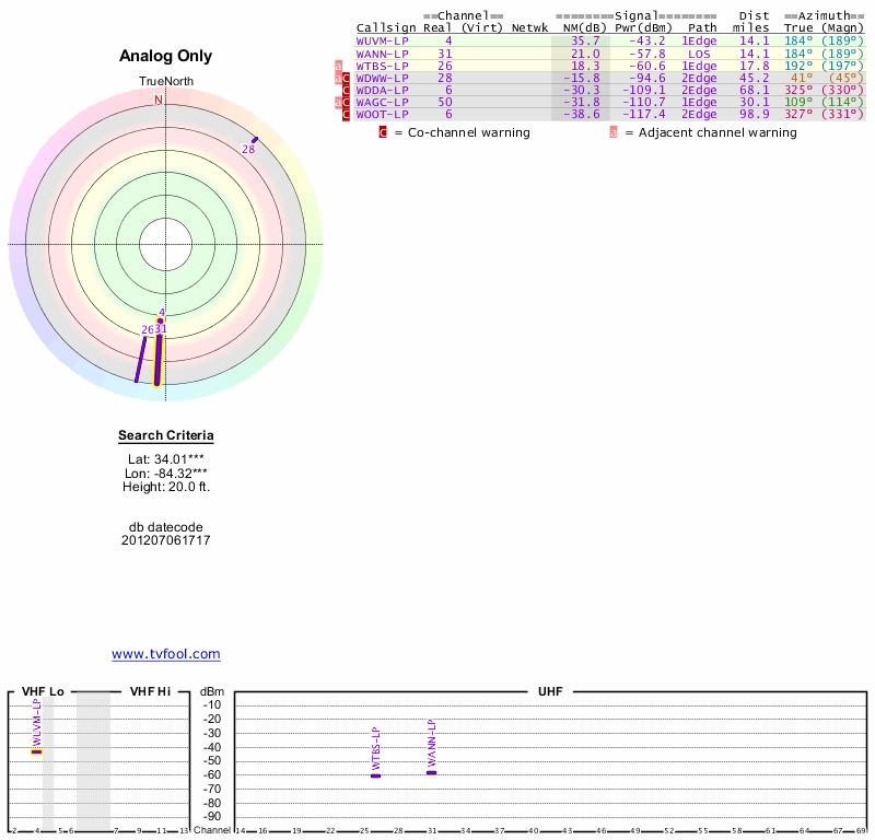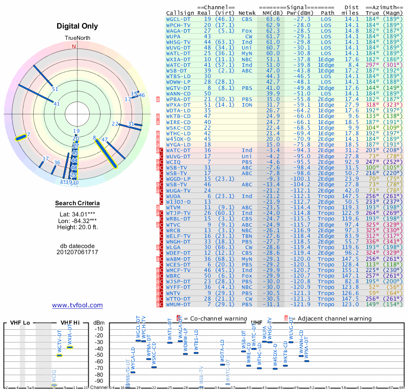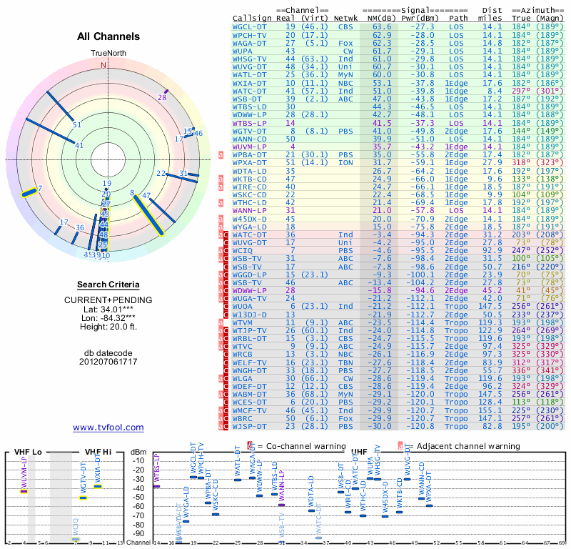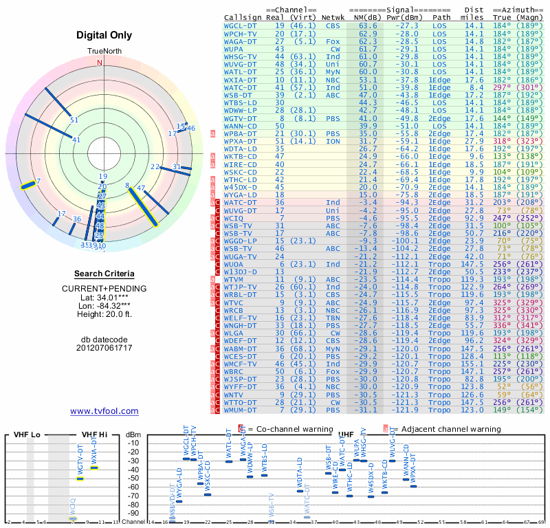Here are the results for your location. The transmitter database was last updated on June 7, 2013. For more information about these plots and how to interpret them, please check out the Signal Analysis FAQ.