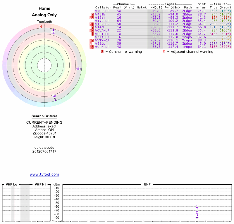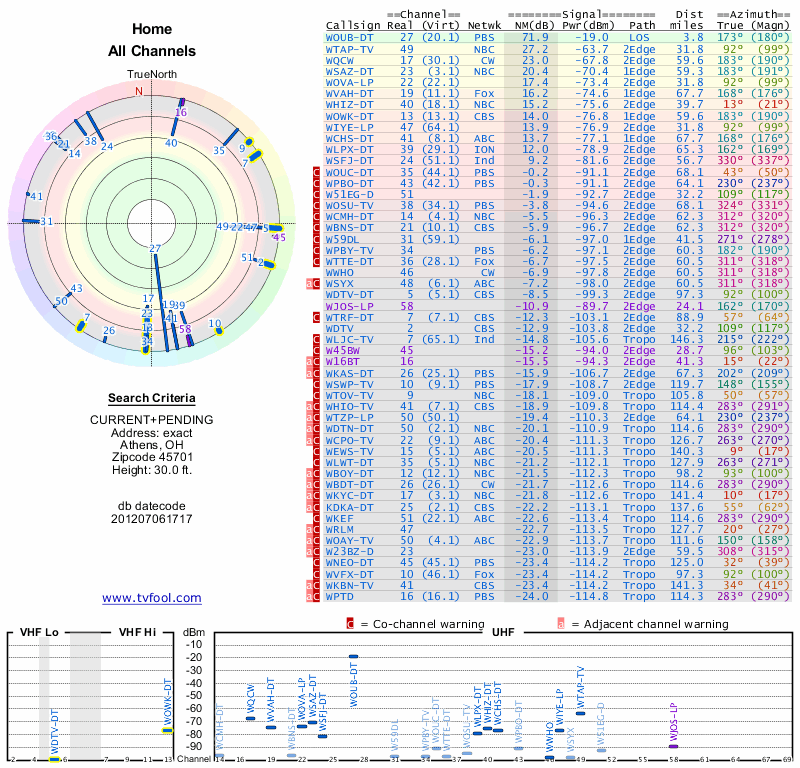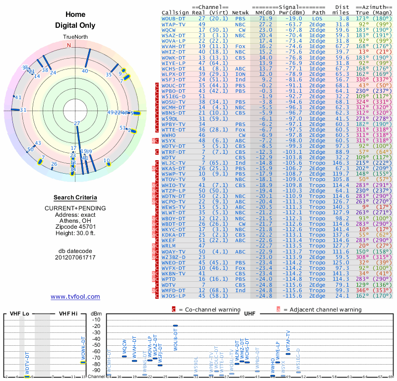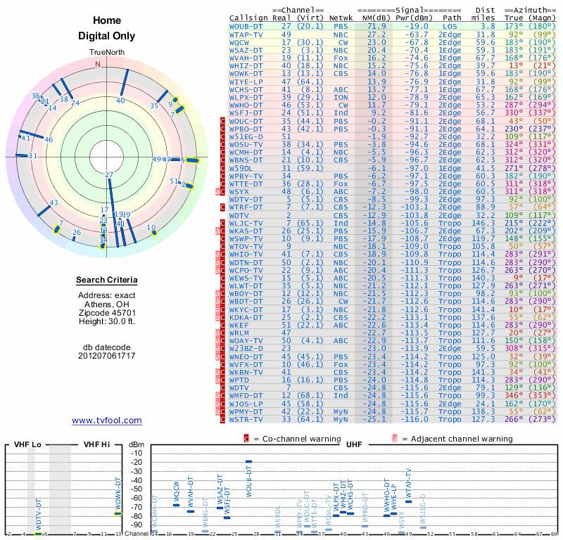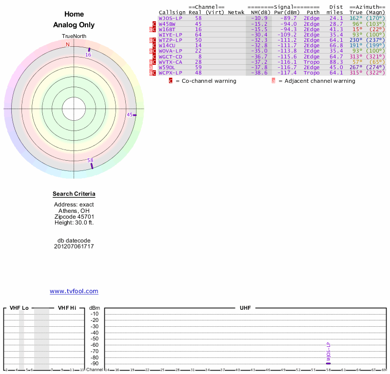 Here are the results for your location. The transmitter database was last updated on June 7, 2013. For more information about these plots and how to interpret them, please check out the Signal Analysis FAQ.