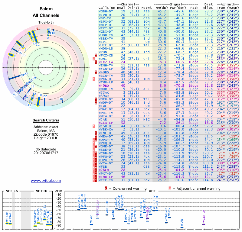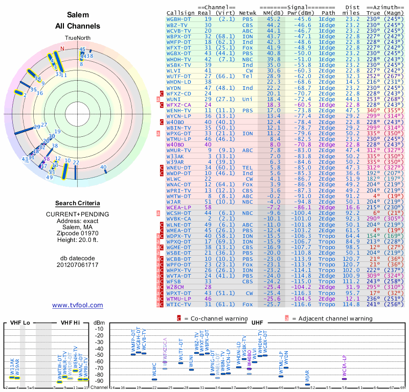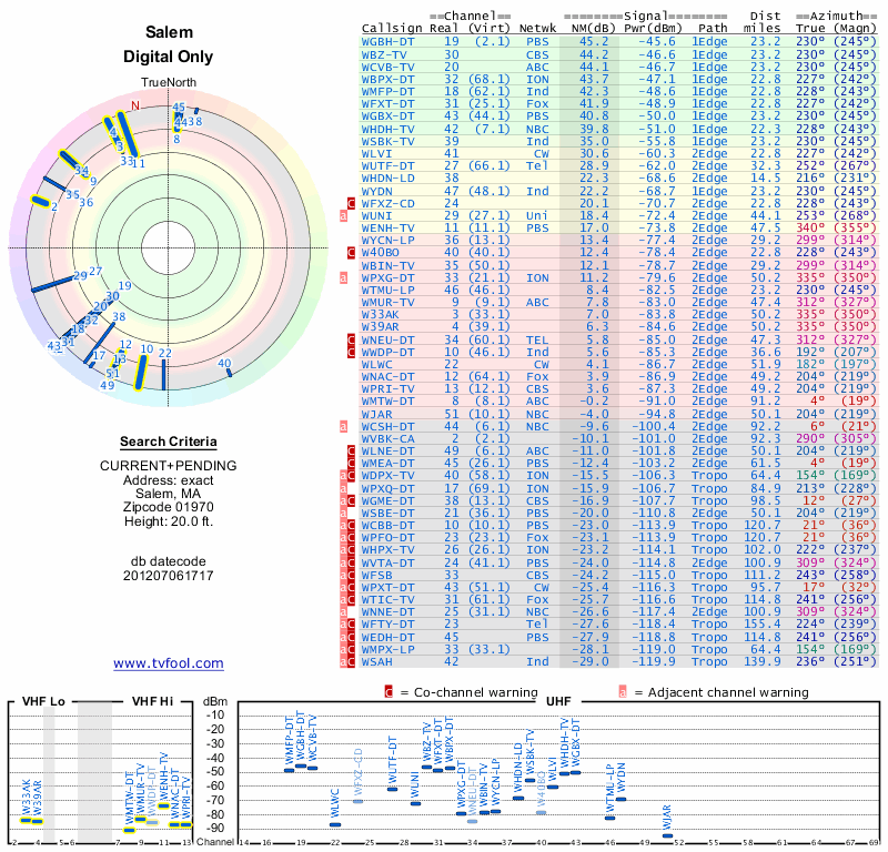 Here are the results for your location. The transmitter database was last updated on June 7, 2013. For more information about these plots and how to interpret them, please check out the Signal Analysis FAQ.