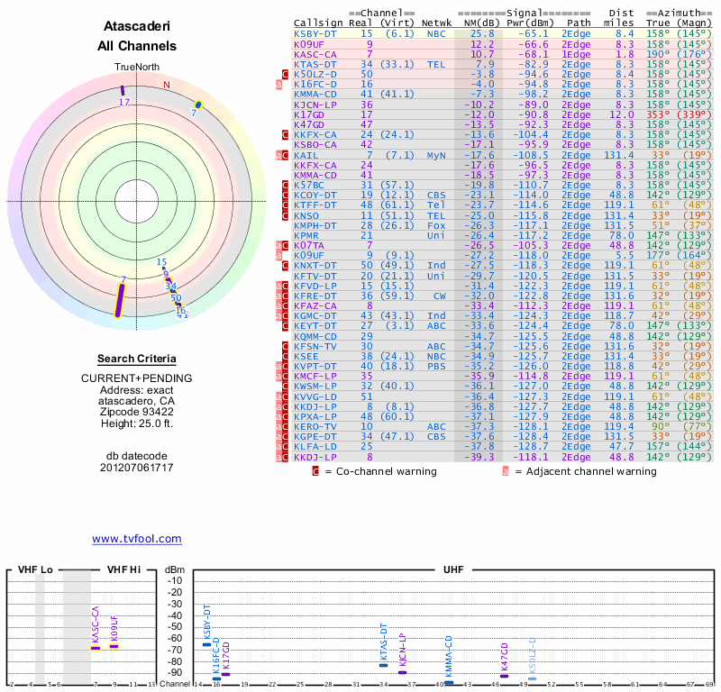 Here are the results for your location. The transmitter database was last updated on June 7, 2013. For more information about these plots and how to interpret them, please check out the Signal Analysis FAQ.