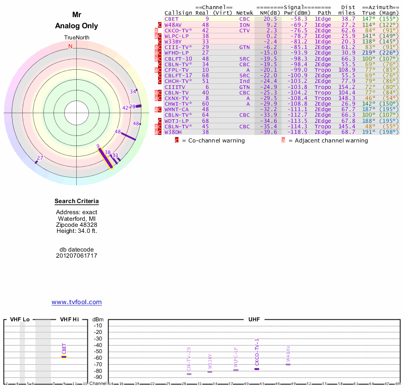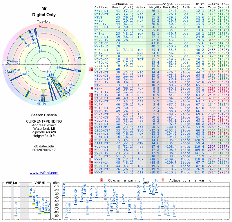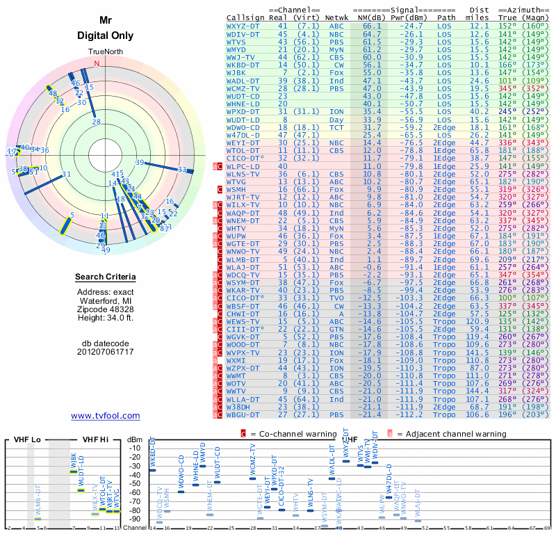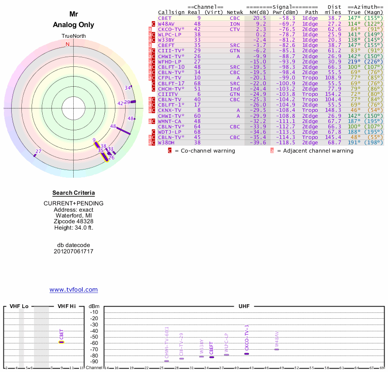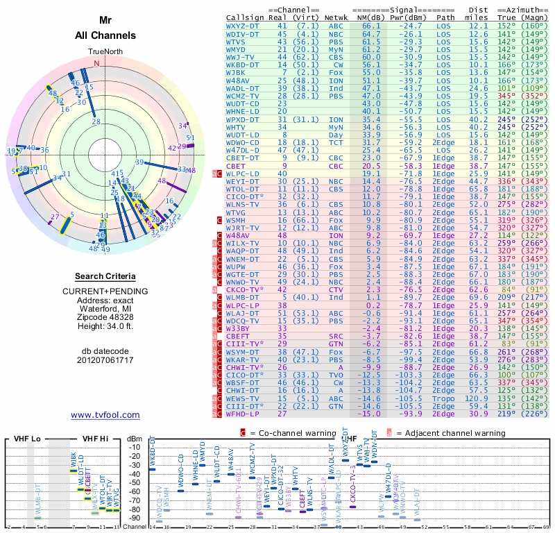 Here are the results for your location. The transmitter database was last updated on June 7, 2013. For more information about these plots and how to interpret them, please check out the Signal Analysis FAQ.