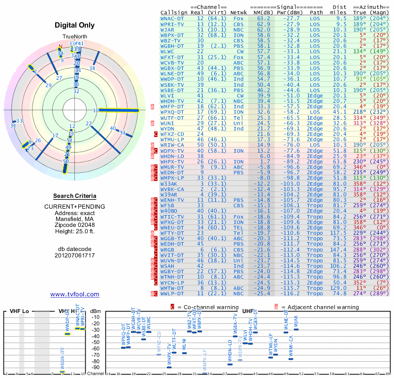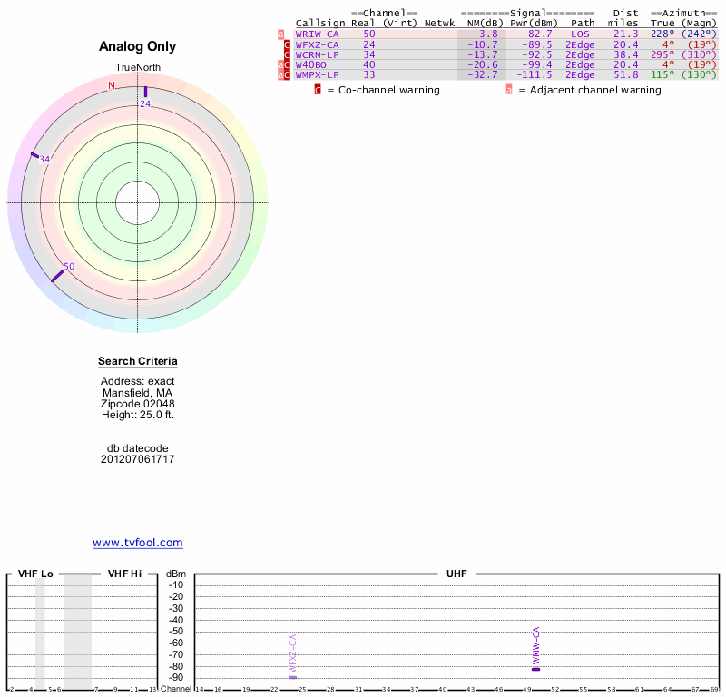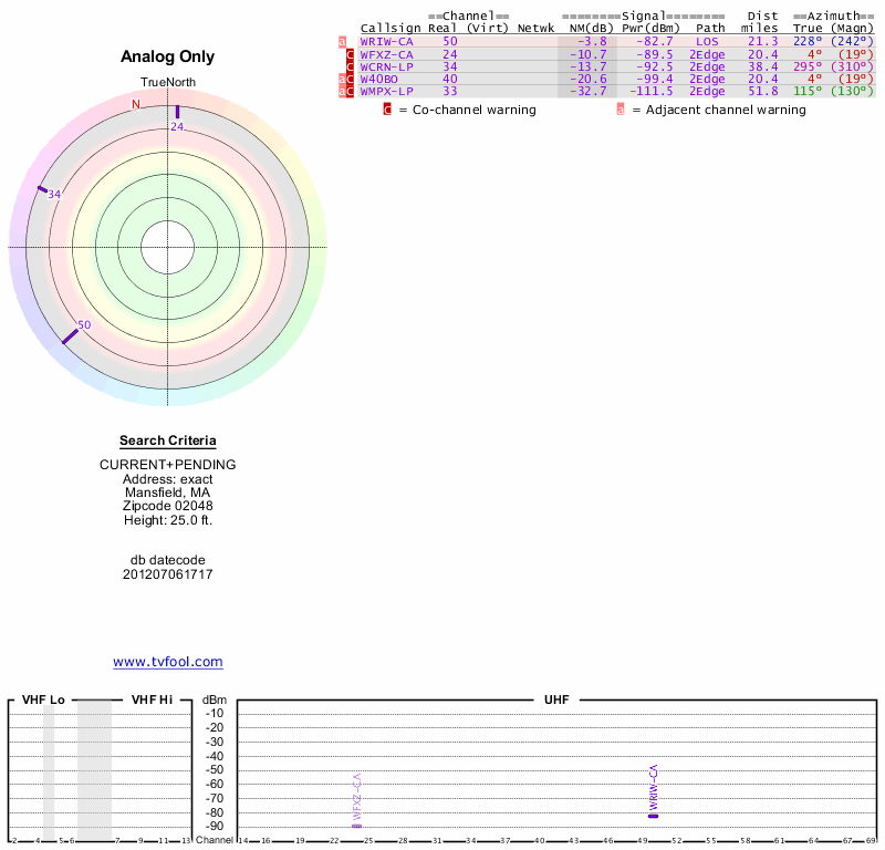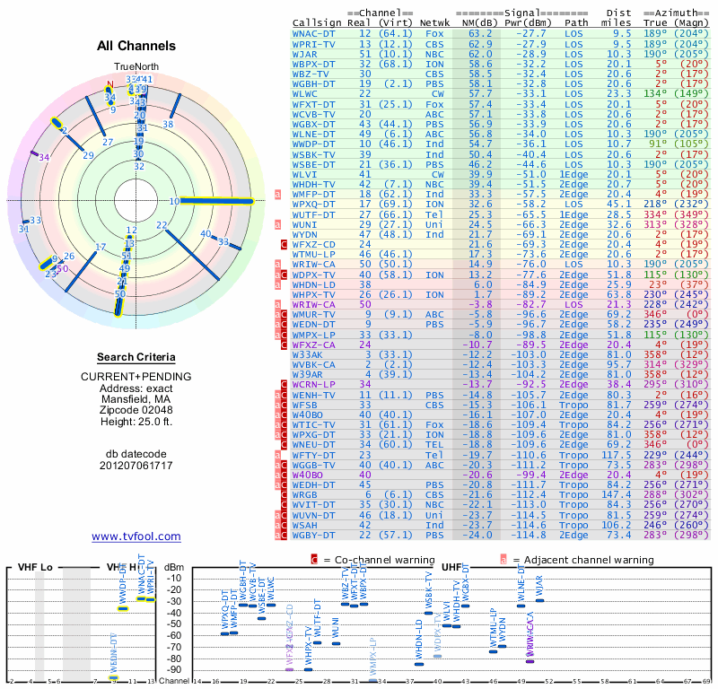 Here are the results for your location. The transmitter database was last updated on June 7, 2013. For more information about these plots and how to interpret them, please check out the Signal Analysis FAQ.
