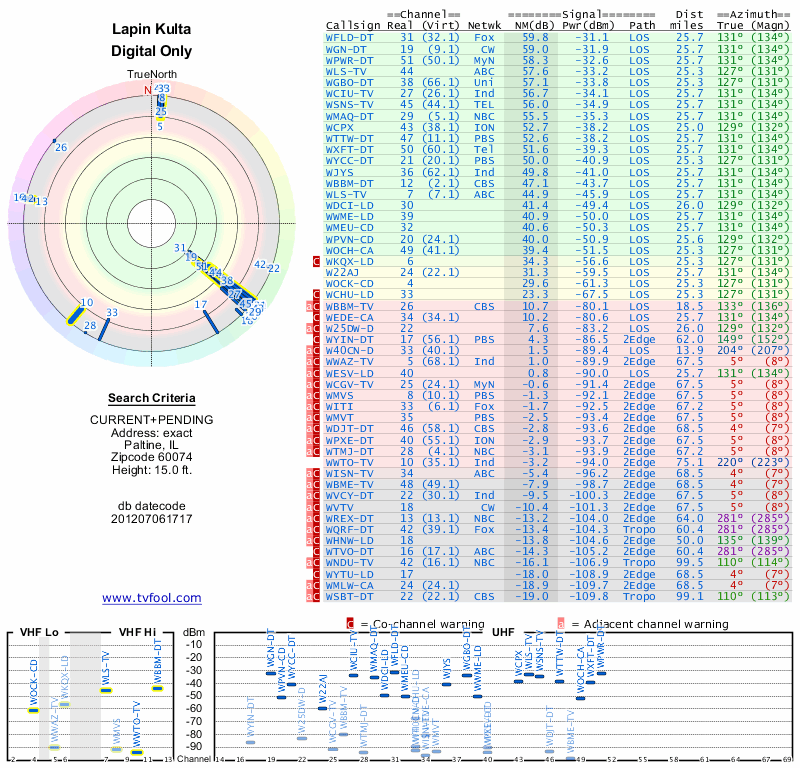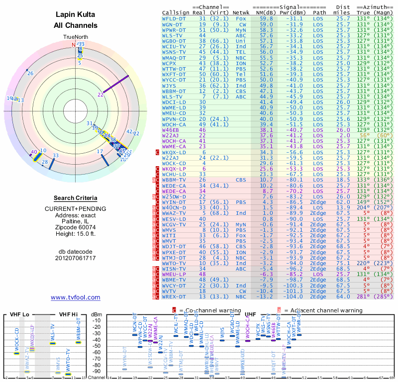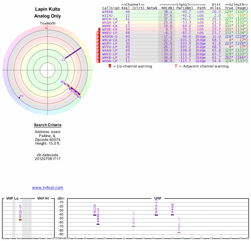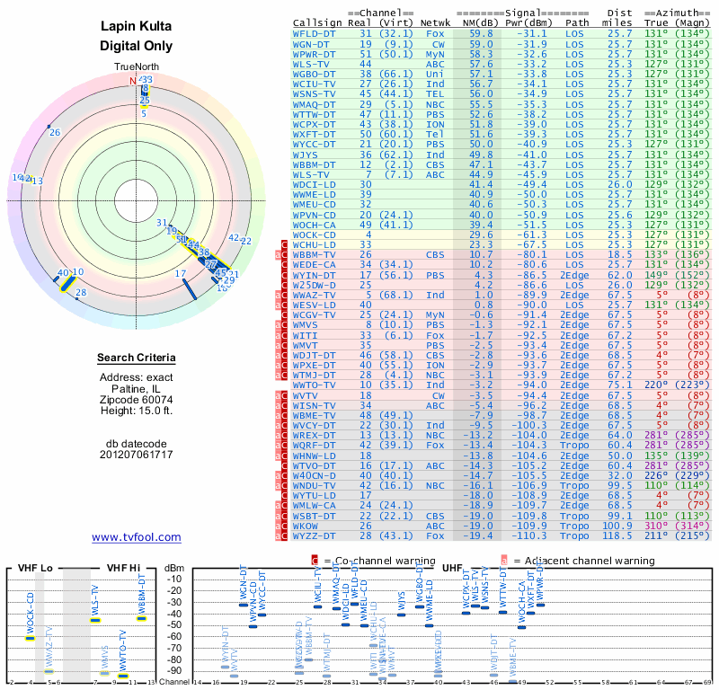 Here are the results for your location. The transmitter database was last updated on June 7, 2013. For more information about these plots and how to interpret them, please check out the Signal Analysis FAQ.