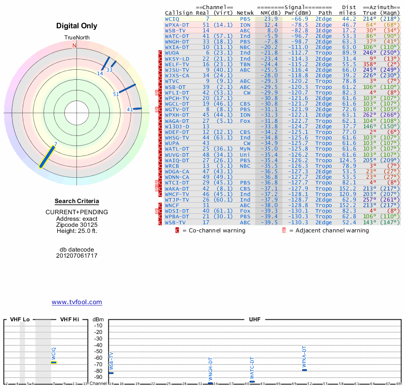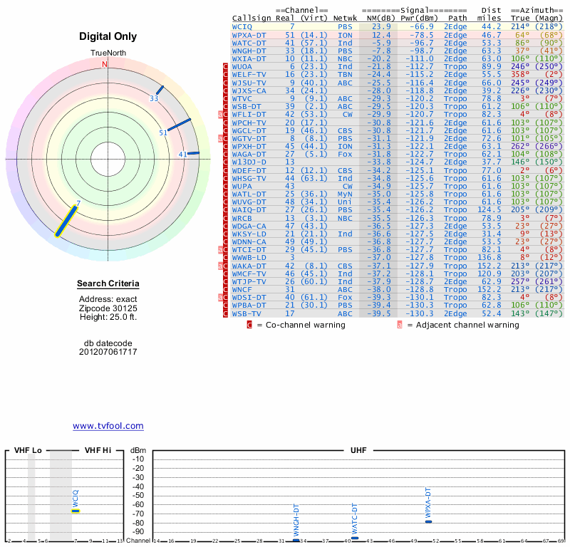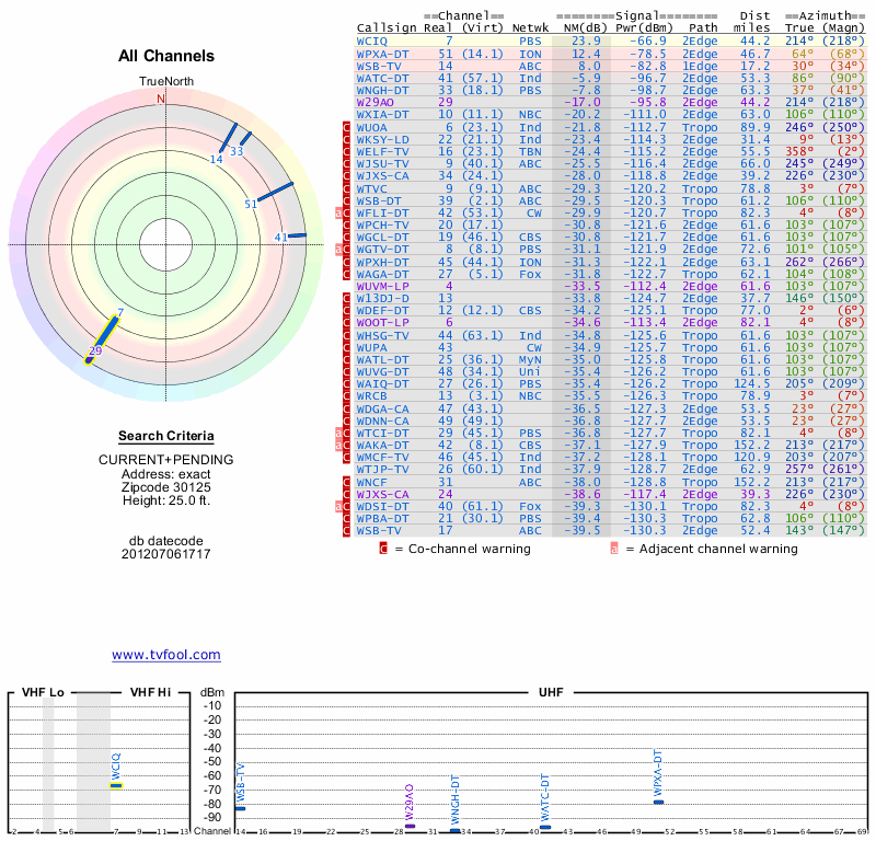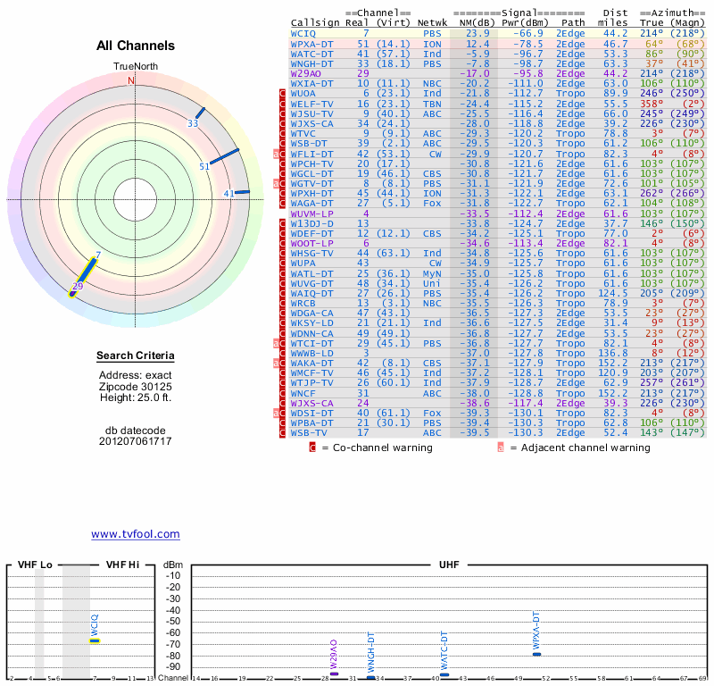 Here are the results for your location. The transmitter database was last updated on June 7, 2013. For more information about these plots and how to interpret them, please check out the Signal Analysis FAQ.