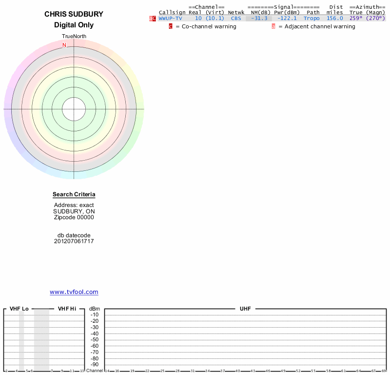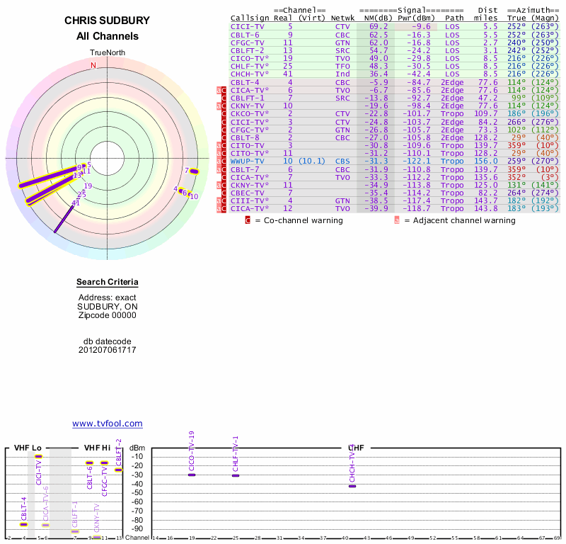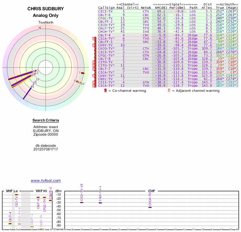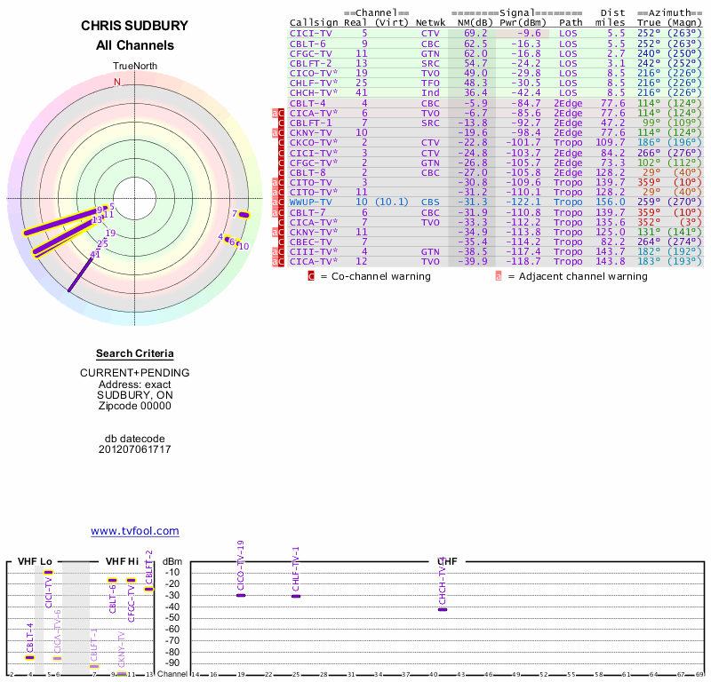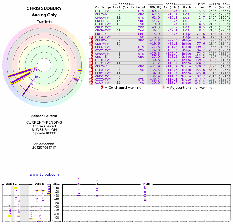 Here are the results for your location. The transmitter database was last updated on June 7, 2013. For more information about these plots and how to interpret them, please check out the Signal Analysis FAQ.