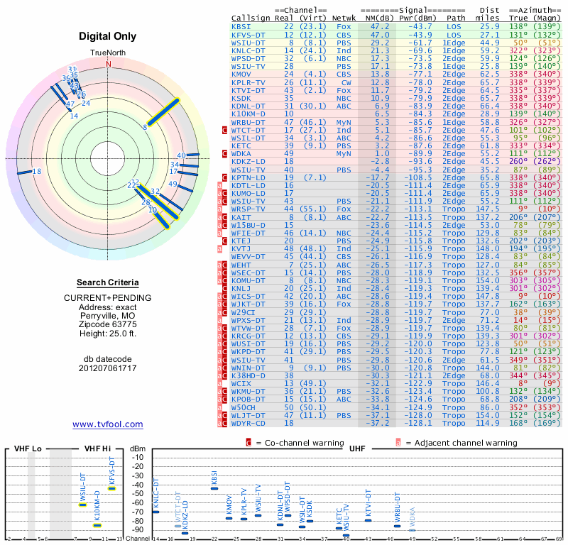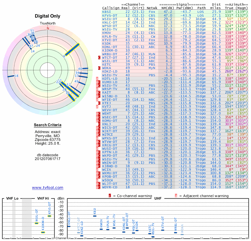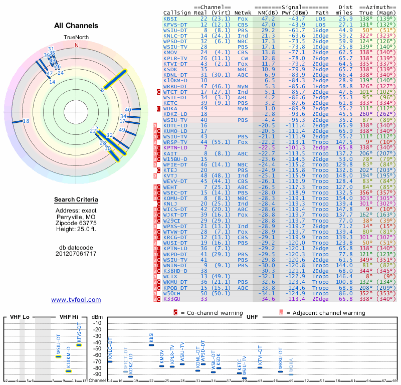 Here are the results for your location. The transmitter database was last updated on June 7, 2013. For more information about these plots and how to interpret them, please check out the Signal Analysis FAQ.